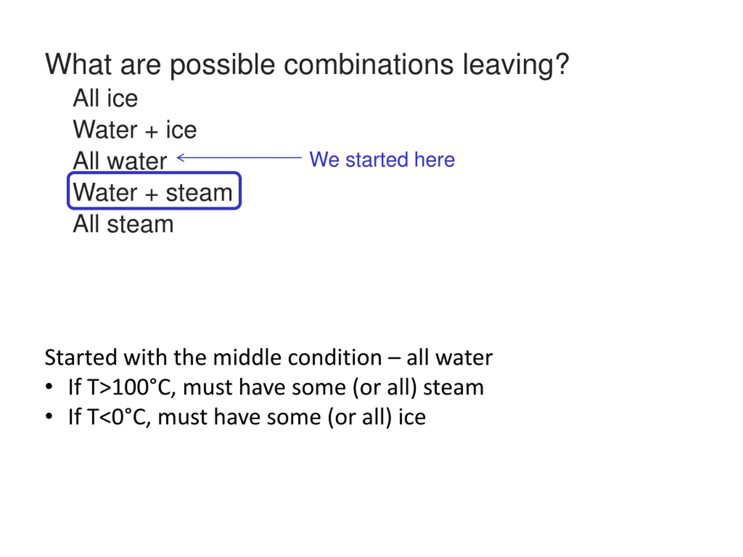 What are possible combinations leaving? All ice Water + ice All water Water + steam All steam We started here Started with the middle condition all water If T>100 C, must have some (or all) steam If T<0 C, must have some (or all) ice