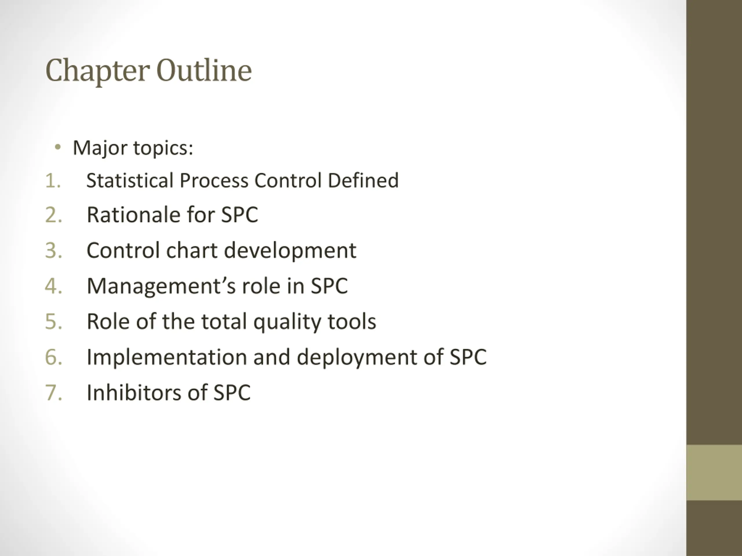 Chapter Outline Major topics: 1. Statistical Process Control Defined 2. Rationale for SPC 3. Control chart development 4. Management s role in SPC 5. Role of the total quality tools 6. Implementation and deployment of SPC 7. Inhibitors of SPC