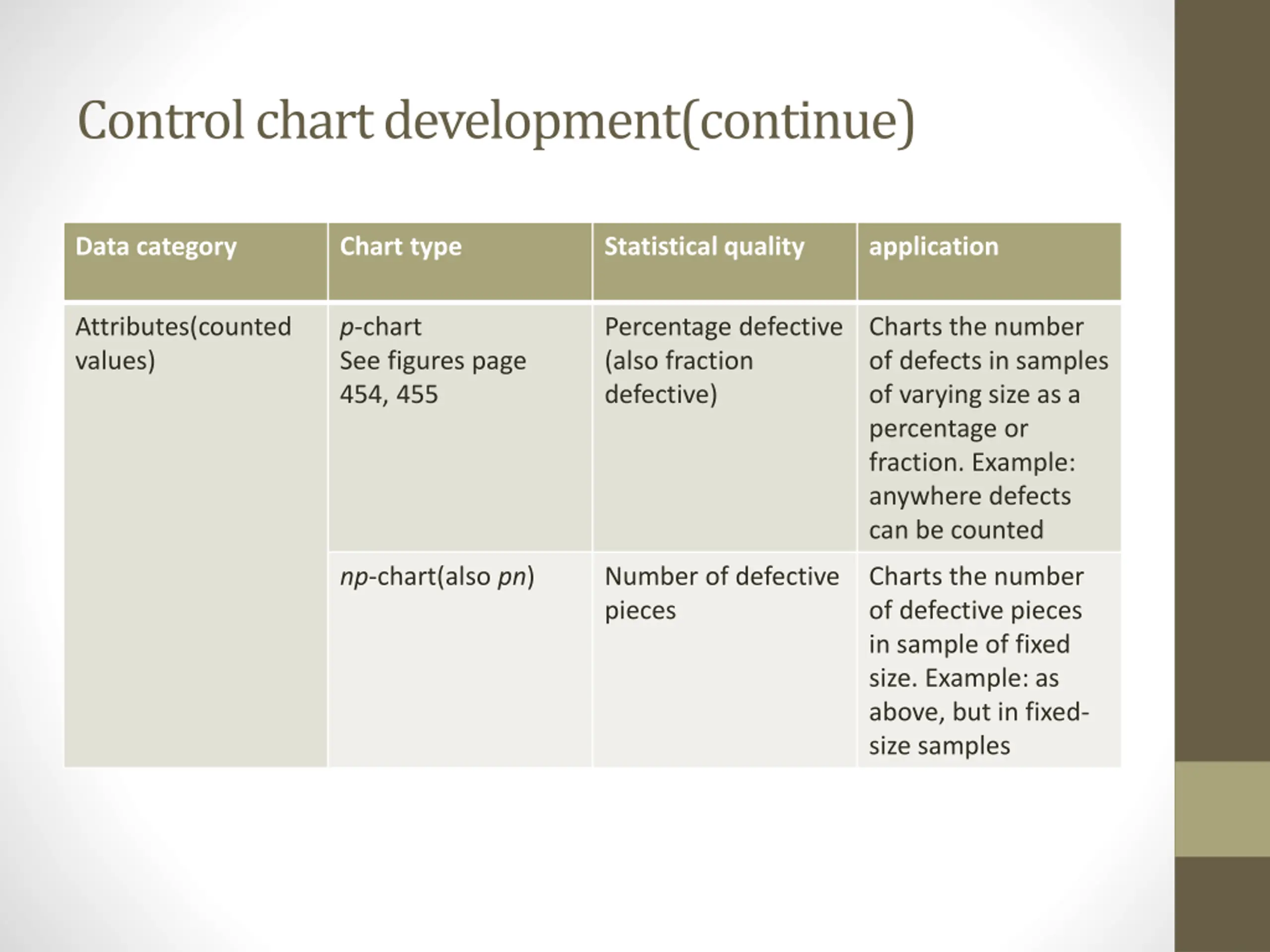 Control chart development(continue) Data category Chart type Statistical quality application Attributes(counted values) p-chart See figures page 454, 455 Percentage defective (also fraction defective) Charts the number of defects in samples of varying size as a percentage or fraction. Example: anywhere defects can be counted np-chart(also pn) Number of defective pieces Charts the number of defective pieces in sample of fixed size. Example: as above, but in fixed- size samples