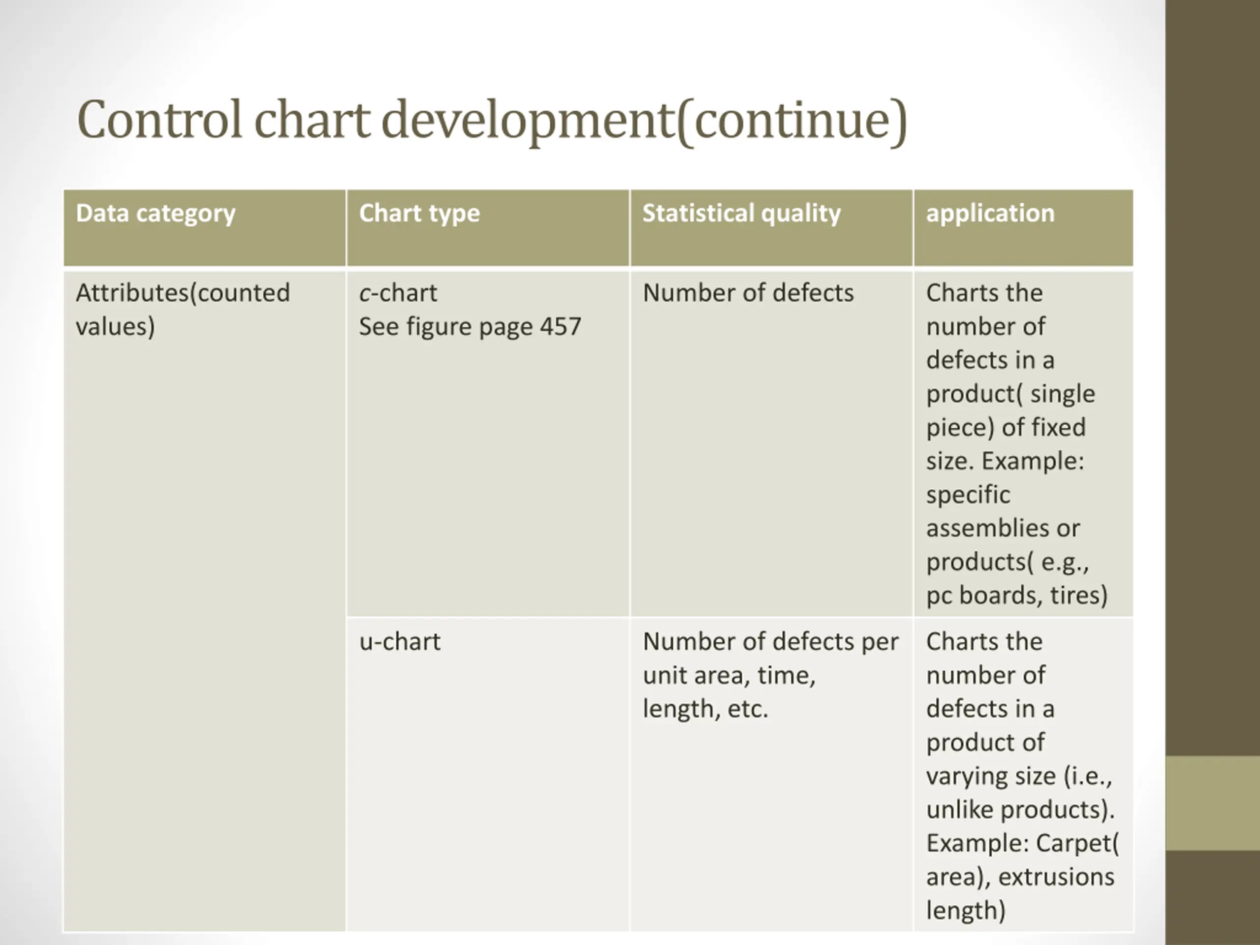 Control chart development(continue) Data category Chart type Statistical quality application Attributes(counted values) c-chart See figure page 457 Number of defects Charts the number of defects in a product( single piece) of fixed size. Example: specific assemblies or products( e.g., pc boards, tires) u-chart Number of defects per unit area, time, length, etc. Charts the number of defects in a product of varying size (i.e., unlike products). Example: Carpet( area), extrusions length)