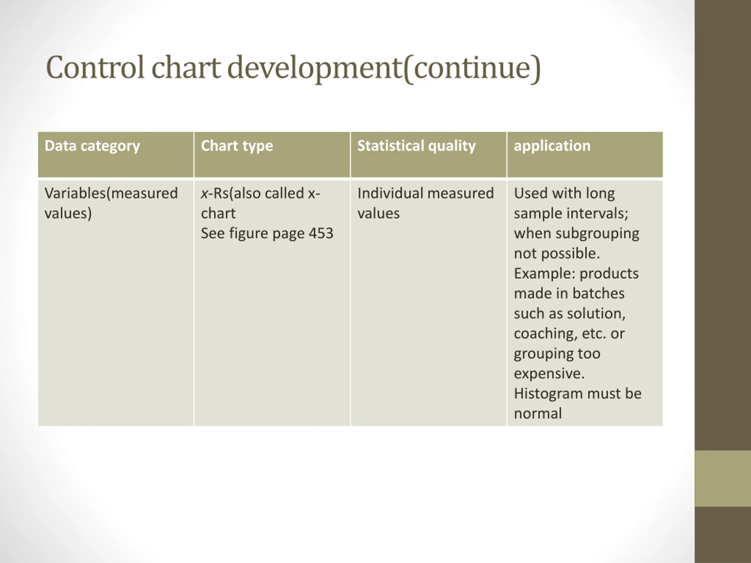 Control chart development(continue) Data category Chart type Statistical quality application Variables(measured values) x-Rs(also called x- chart See figure page 453 Individual measured values Used with long sample intervals; when subgrouping not possible. Example: products made in batches such as solution, coaching, etc. or grouping too expensive. Histogram must be normal