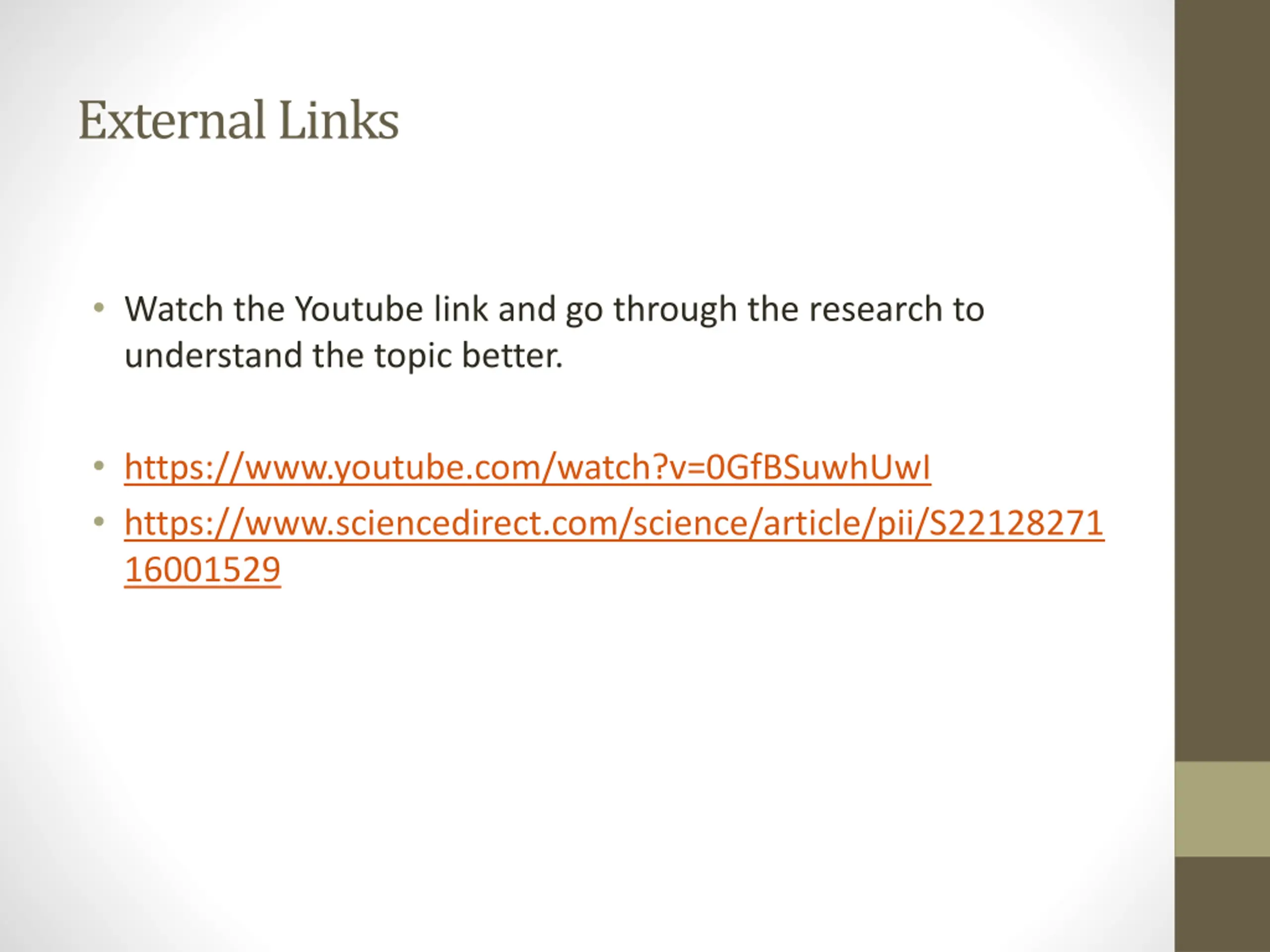 External Links Watch the Youtube link and go through the research to understand the topic better. https://www.youtube.com/watch?v=0GfBSuwhUwI https://www.sciencedirect.com/science/article/pii/S22128271 16001529