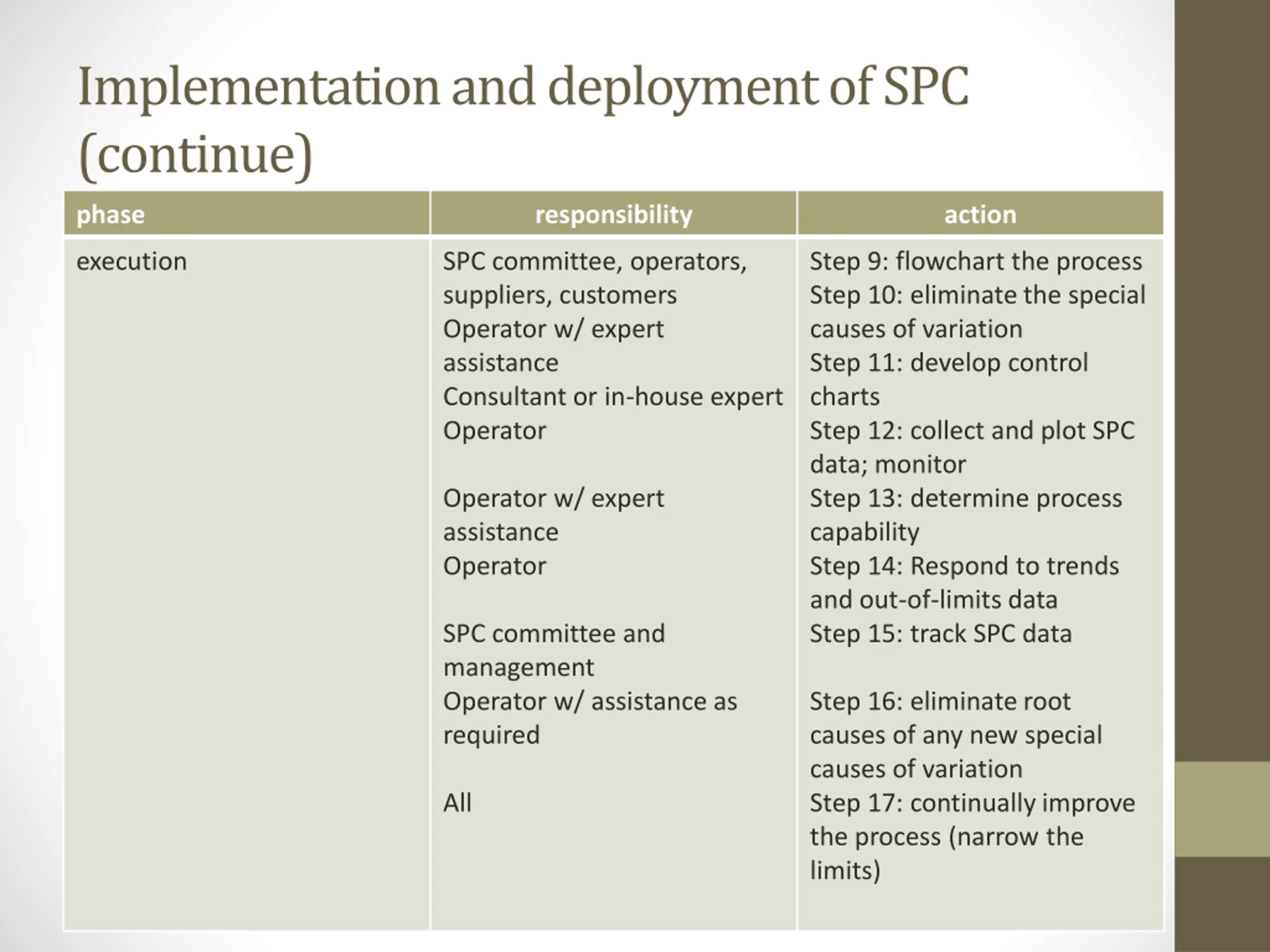 Implementation and deployment of SPC (continue) phase responsibility action execution SPC committee, operators, suppliers, customers Operator w/ expert assistance Consultant or in-house expert Operator Step 9: flowchart the process Step 10: eliminate the special causes of variation Step 11: develop control charts Step 12: collect and plot SPC data; monitor Step 13: determine process capability Step 14: Respond to trends and out-of-limits data Step 15: track SPC data Operator w/ expert assistance Operator SPC committee and management Operator w/ assistance as required Step 16: eliminate root causes of any new special causes of variation Step 17: continually improve the process (narrow the limits) All