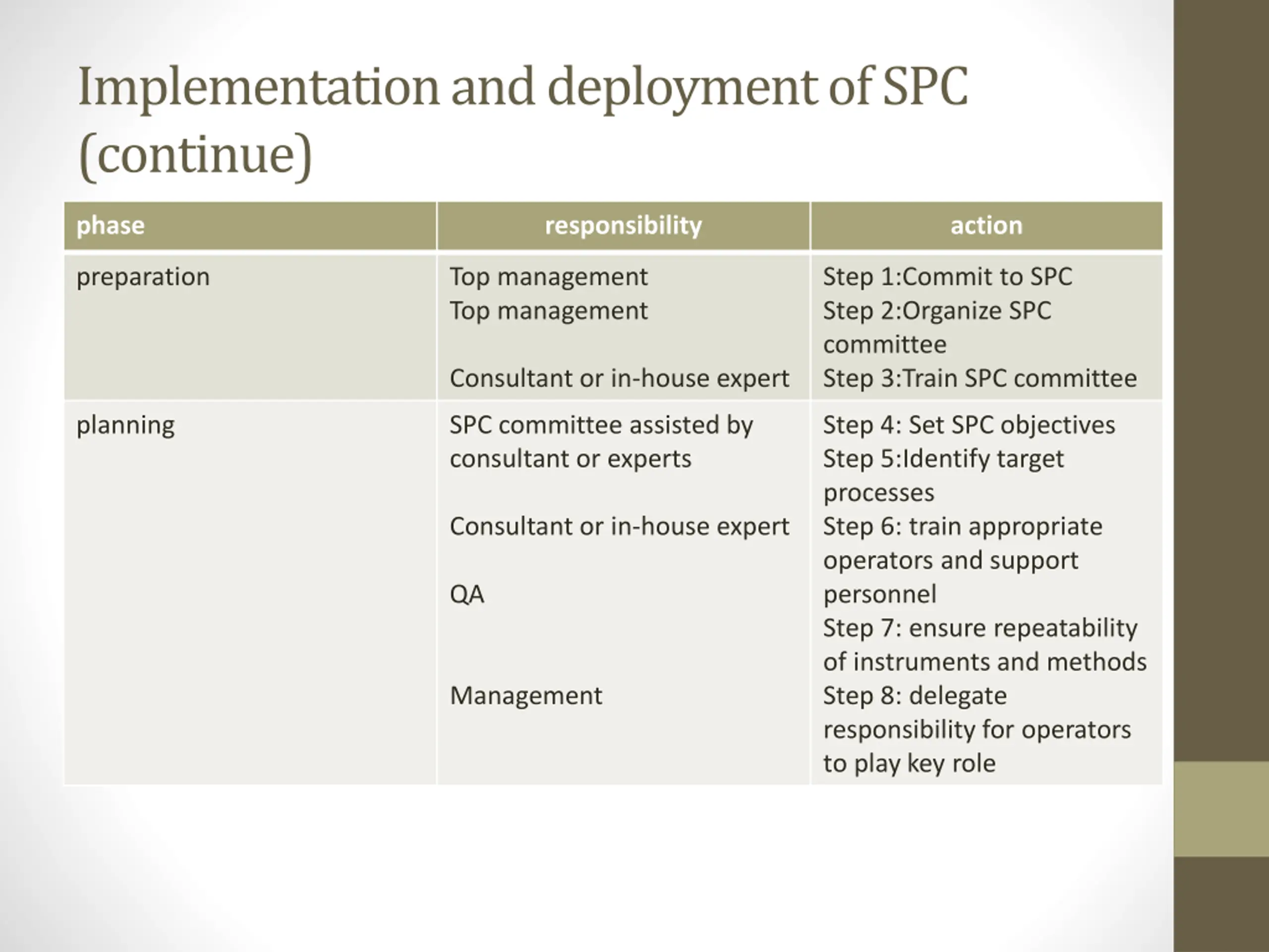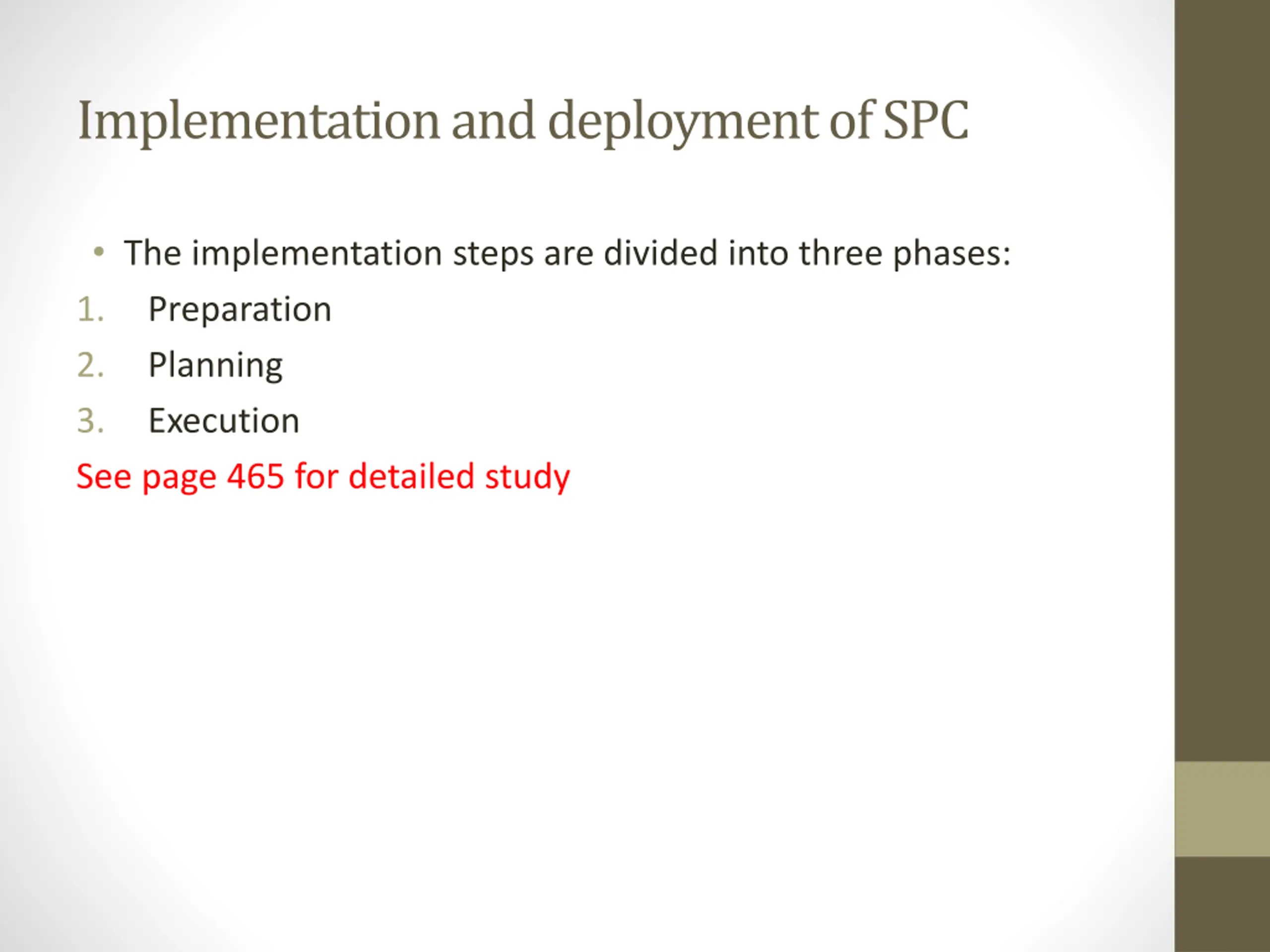 Implementation and deployment of SPC The implementation steps are divided into three phases: 1. Preparation 2. Planning 3. Execution See page 465 for detailed study