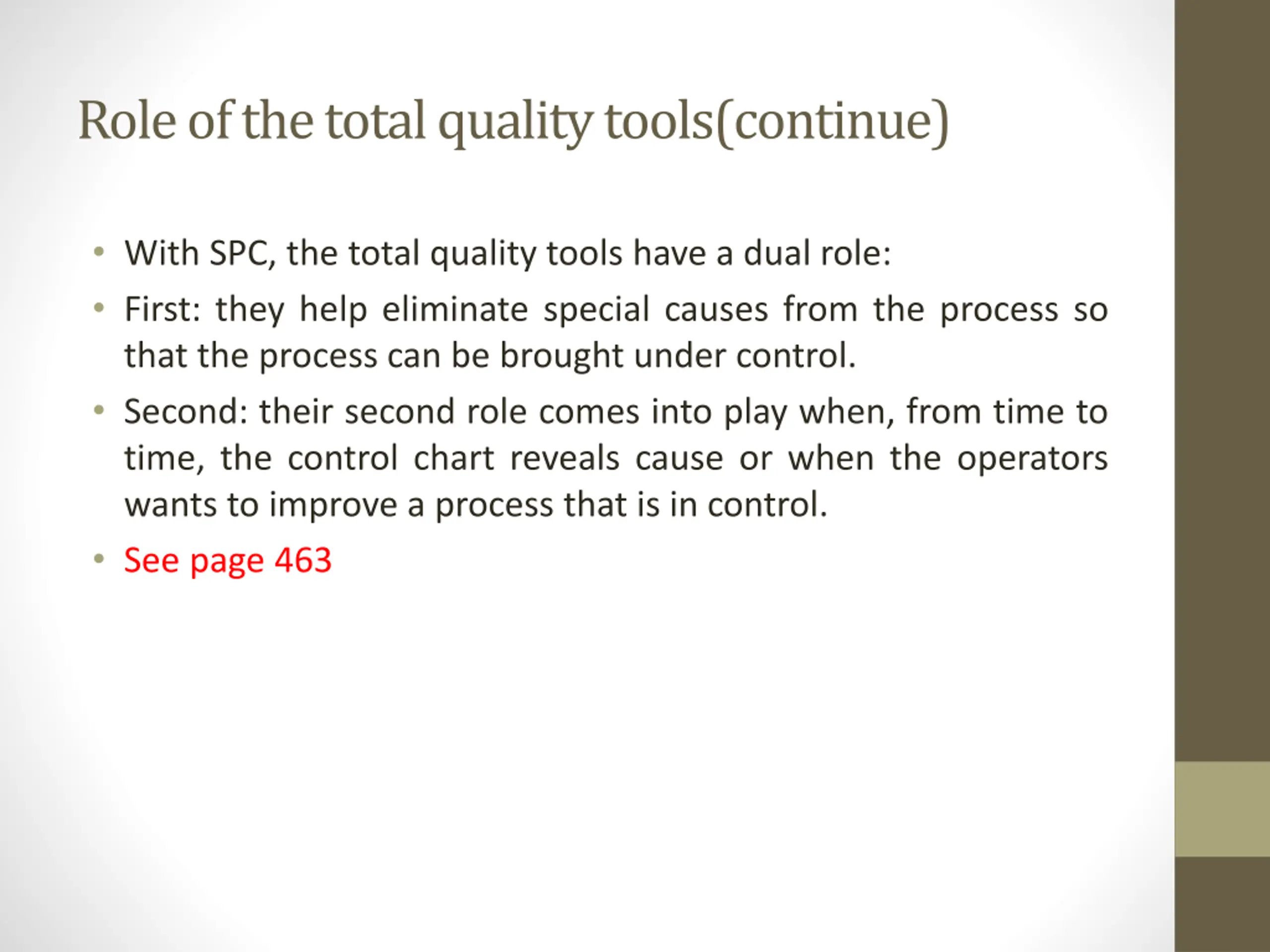 Role of the total quality tools(continue) With SPC, the total quality tools have a dual role: First: they help eliminate special causes from the process so that the process can be brought under control. Second: their second role comes into play when, from time to time, the control chart reveals cause or when the operators wants to improve a process that is in control. See page 463