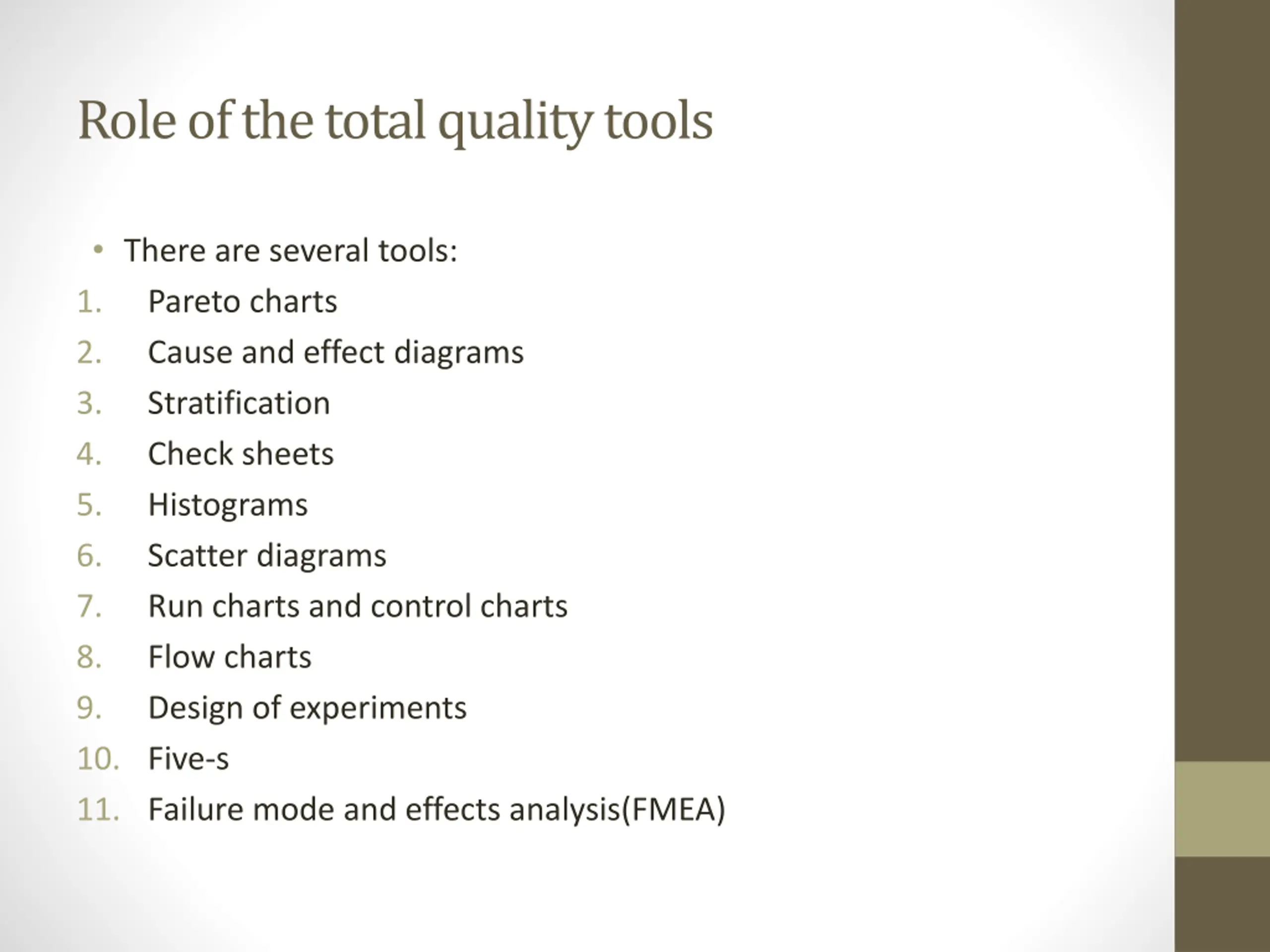 Role of the total quality tools There are several tools: 1. Pareto charts 2. Cause and effect diagrams 3. Stratification 4. Check sheets 5. Histograms 6. Scatter diagrams 7. Run charts and control charts 8. Flow charts 9. Design of experiments 10. Five-s 11. Failure mode and effects analysis(FMEA)
