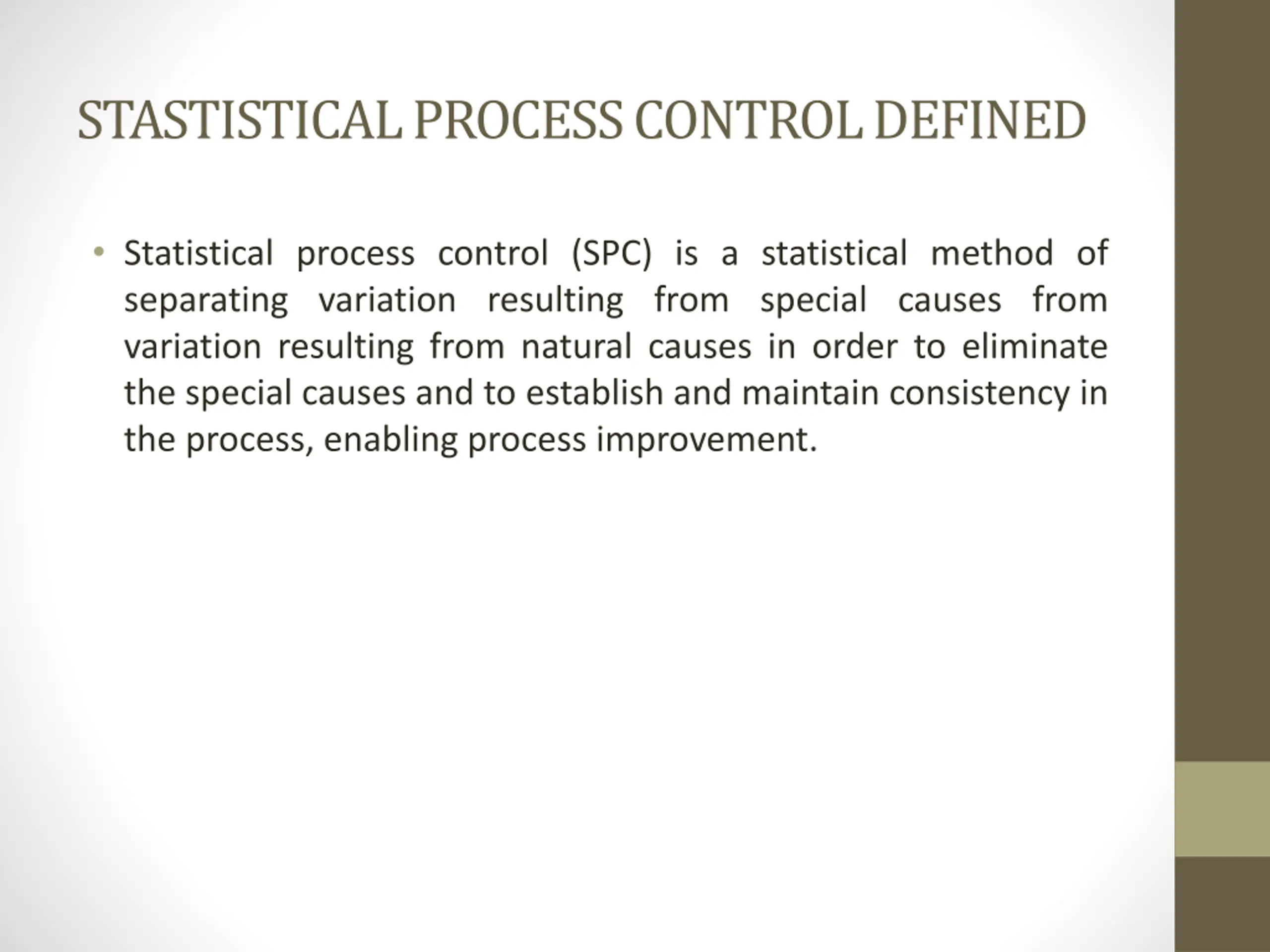 STASTISTICAL PROCESS CONTROL DEFINED Statistical process control (SPC) is a statistical method of separating variation resulting from special causes from variation resulting from natural causes in order to eliminate the special causes and to establish and maintain consistency in the process, enabling process improvement.