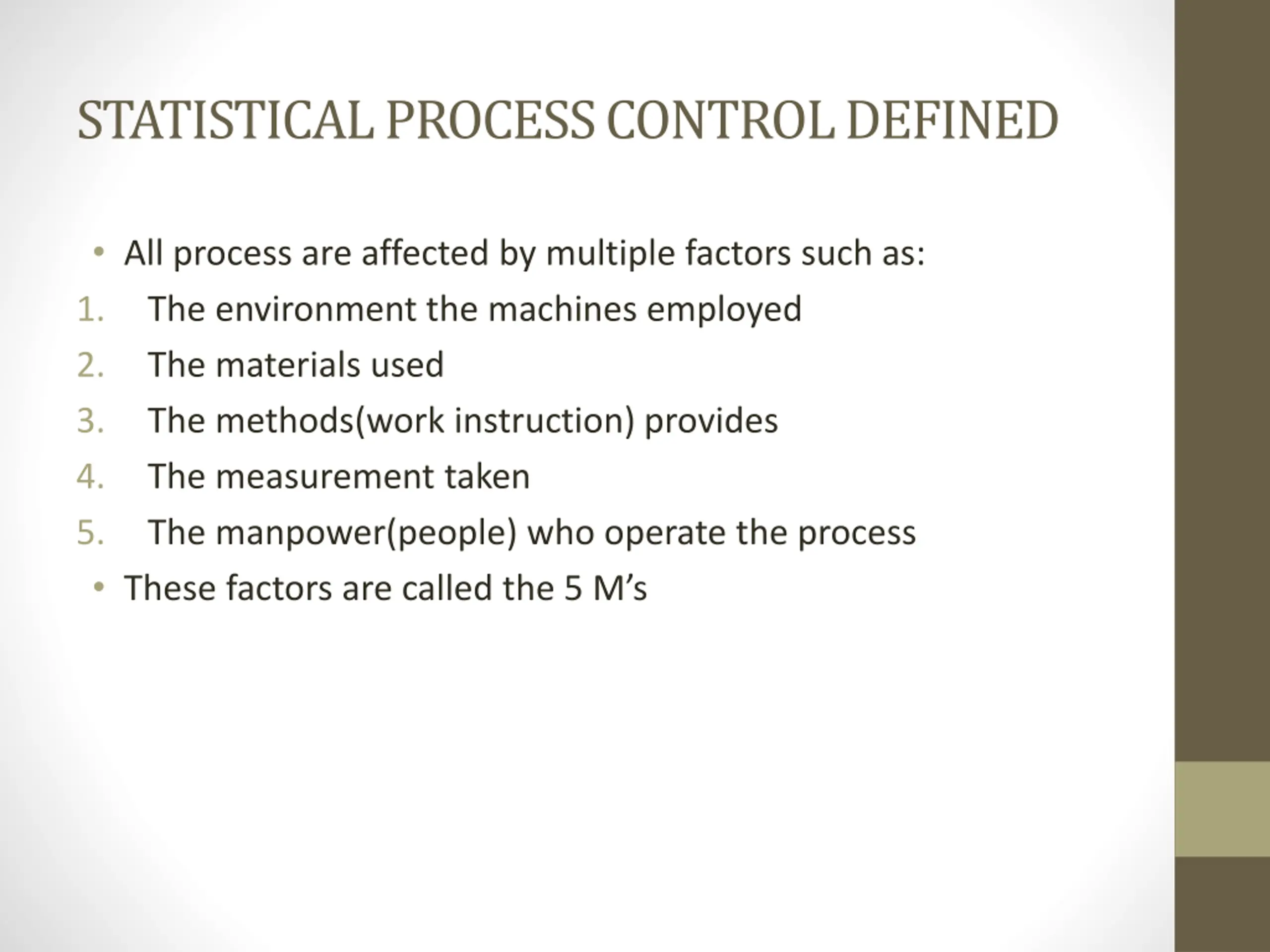STATISTICAL PROCESS CONTROL DEFINED All process are affected by multiple factors such as: 1. The environment the machines employed 2. The materials used 3. The methods(work instruction) provides 4. The measurement taken 5. The manpower(people) who operate the process These factors are called the 5 M s