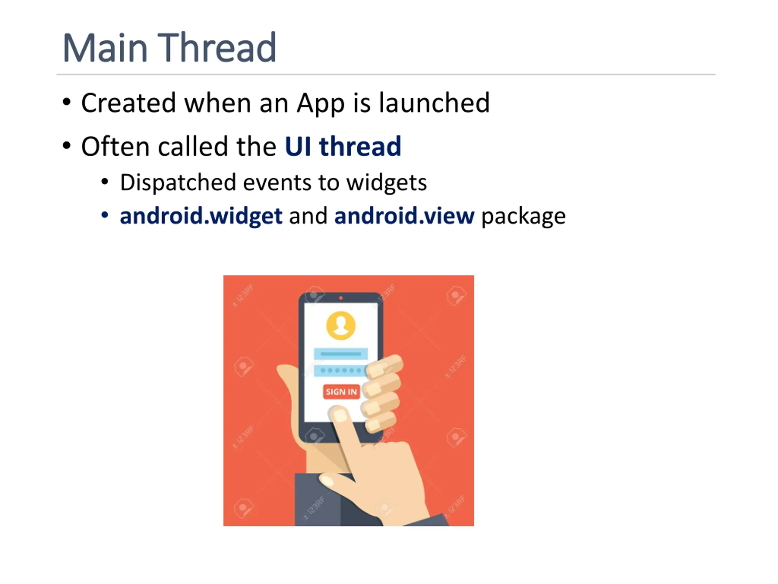 Main Thread Main Thread Created when an App is launched Often called the UI thread Dispatched events to widgets android.widget and android.view package
