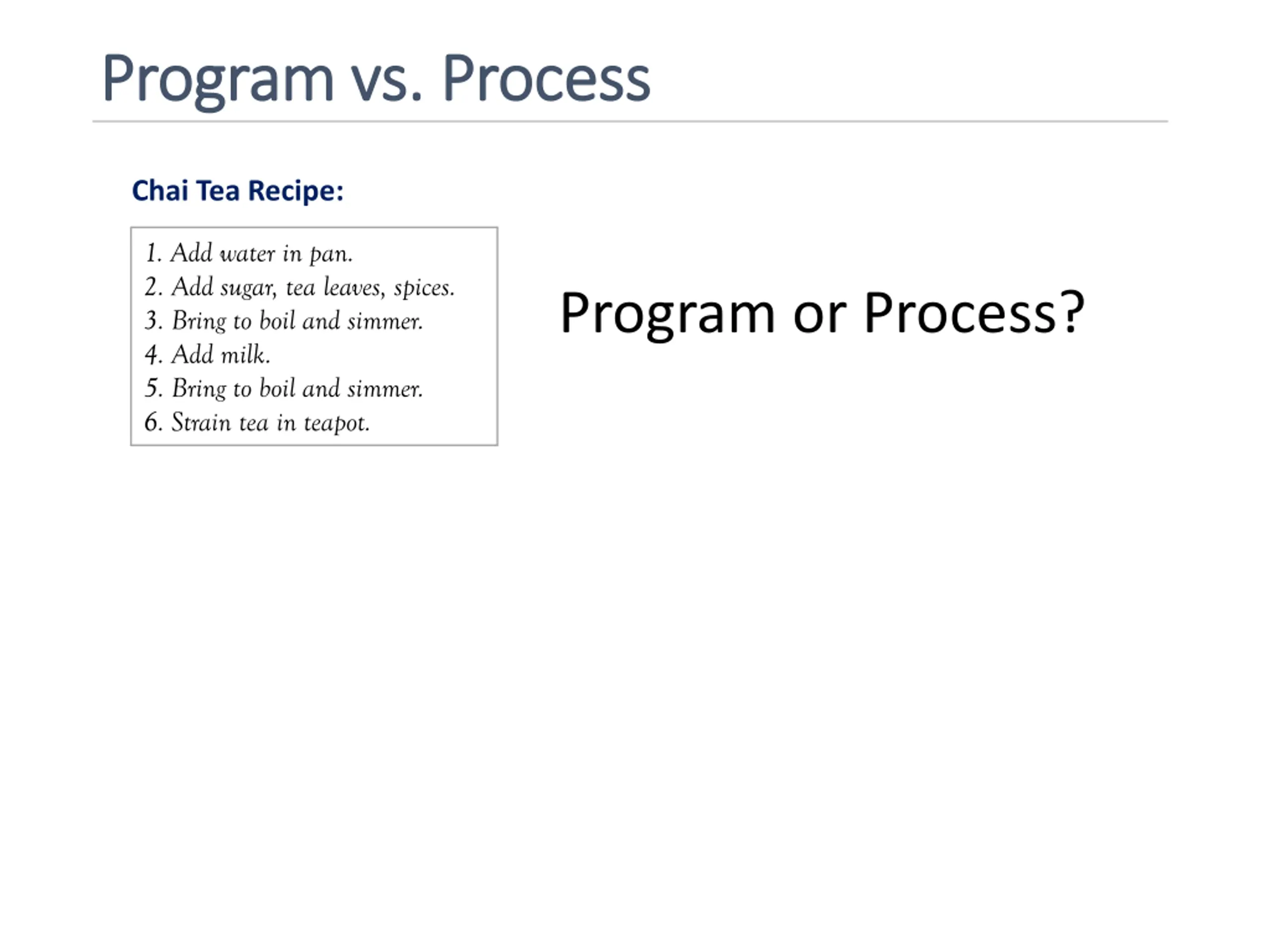 Program vs. Process Program vs. Process Chai Tea Recipe: 1. Add water in pan. 2. Add sugar, tea leaves, spices. 3. Bring to boil and simmer. 4. Add milk. 5. Bring to boil and simmer. 6. Strain tea in teapot. Program or Process?