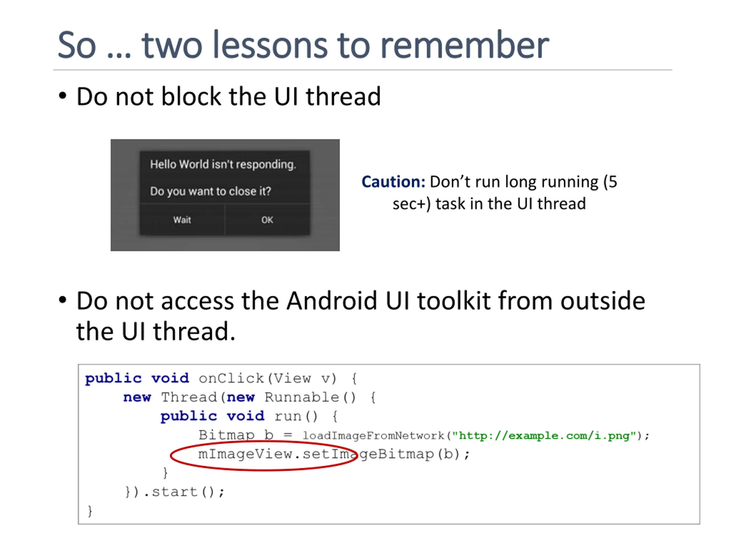 1. Access UI Thread from Other Threads 1. Access UI Thread from Other Threads Use one of these three: Activity.runOnUiThread (Runnable) View.post (Runnable) View.postDelayed (Runnable, long) Runs in UI Thread Runs in worker Thread public void onClick(View v) { new Thread(new Runnable() { public void run() { final Bitmap bitmap = loadImageFromNetwork("http://example.com/image.png"); mImageView.post(new Runnable() { public void run() { mImageView.setImageBitmap(bitmap); } }); } }).start(); }