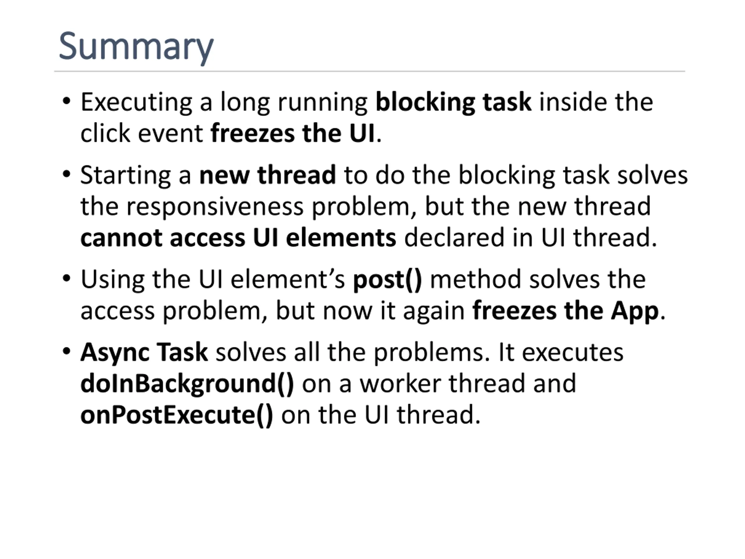 Summary Summary Executing a long running blocking task inside the click event freezes the UI. Starting a new thread to do the blocking task solves the responsiveness problem, but the new thread cannot access UI elements declared in UI thread. Using the UI element s post() method solves the access problem, but now it again freezes the App. Async Task solves all the problems. It executes doInBackground() on a worker thread and onPostExecute() on the UI thread.