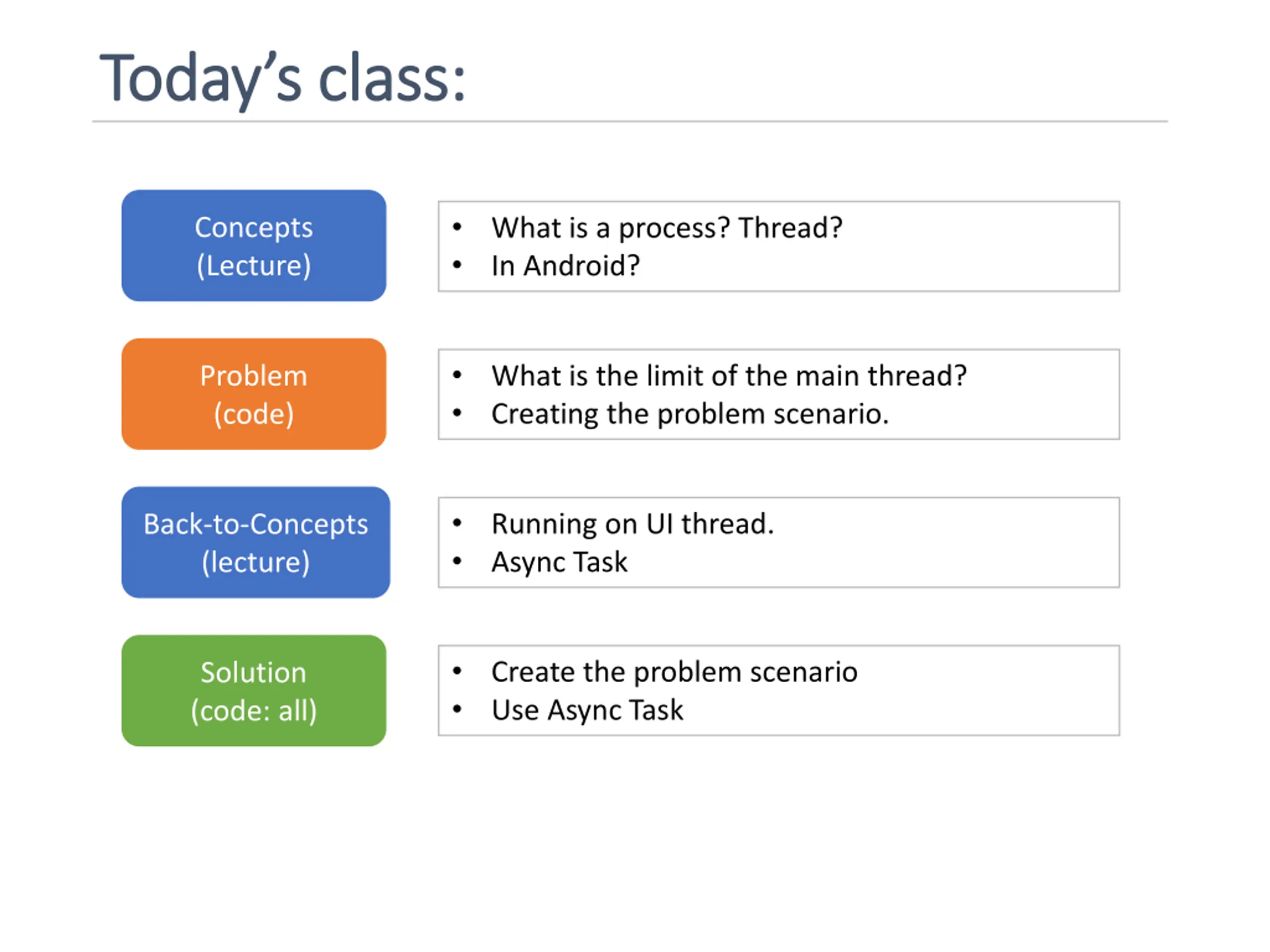 Todays class: Today s class: Concepts (Lecture) What is a process? Thread? In Android? What is the limit of the main thread? Creating the problem scenario. Problem (code) Running on UI thread. Async Task Back-to-Concepts (lecture) Create the problem scenario Use Async Task Solution (code: all)