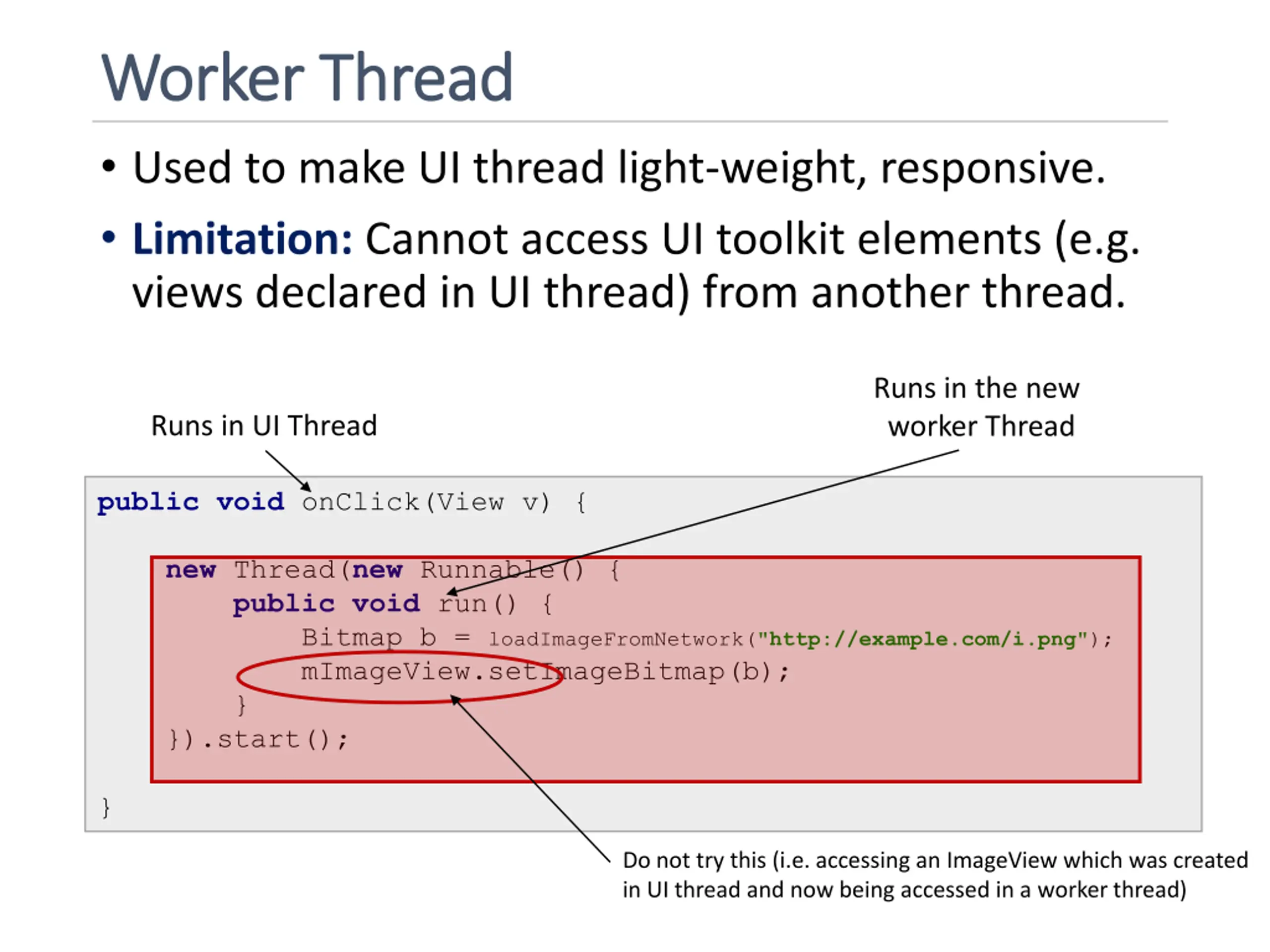 Worker Thread Worker Thread Used to make UI thread light-weight, responsive. Limitation: Cannot access UI toolkit elements (e.g. views declared in UI thread) from another thread. Runs in the new worker Thread Runs in UI Thread public void onClick(View v) { new Thread(new Runnable() { public void run() { Bitmap b = loadImageFromNetwork("http://example.com/i.png"); mImageView.setImageBitmap(b); } }).start(); } Do not try this (i.e. accessing an ImageView which was created in UI thread and now being accessed in a worker thread)