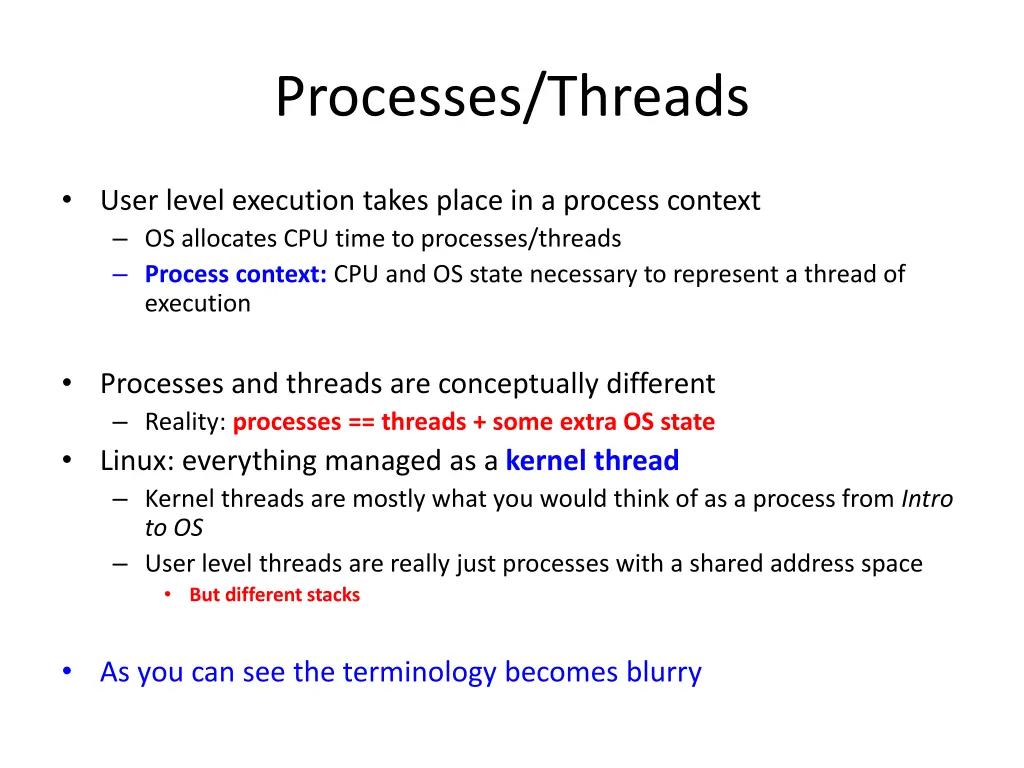 Processes/Threads User level execution takes place in a process context OS allocates CPU time to processes/threads Process context: CPU and OS state necessary to represent a thread of execution Processes and threads are conceptually different Reality: processes == threads + some extra OS state Linux: everything managed as a kernel thread Kernel threads are mostly what you would think of as a process from Intro to OS User level threads are really just processes with a shared address space But different stacks As you can see the terminology becomes blurry