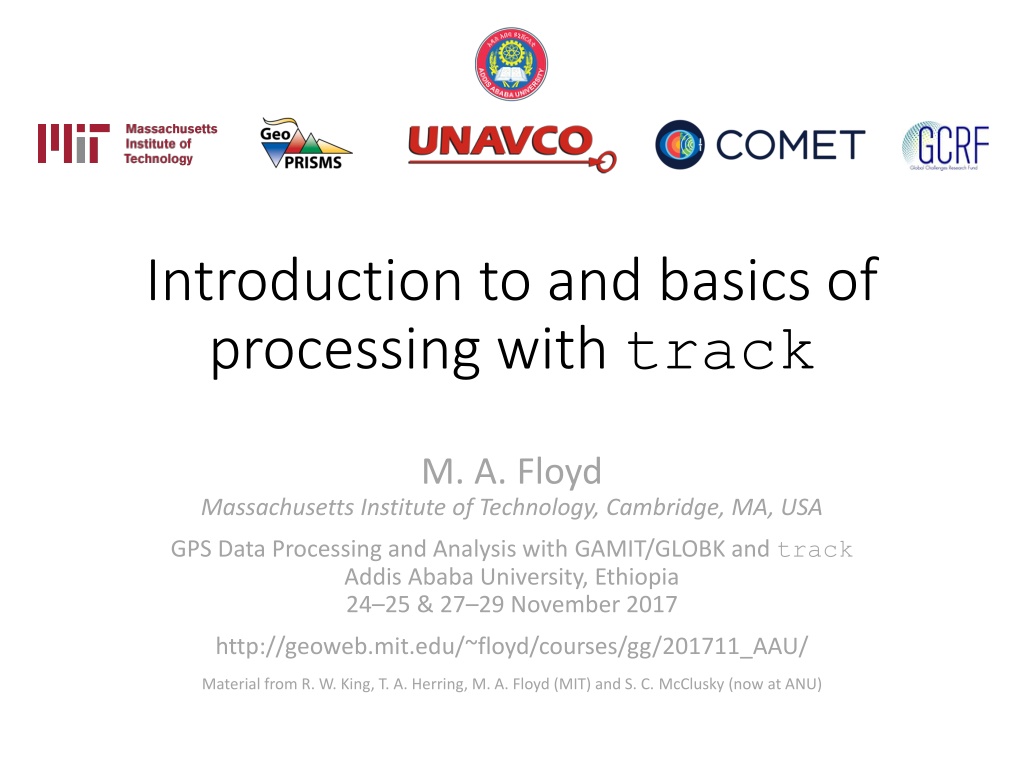 Introduction to and basics of processing with track M. A. Floyd Massachusetts Institute of Technology, Cambridge, MA, USA GPS Data Processing and Analysis with GAMIT/GLOBK and track Addis Ababa University, Ethiopia 24 25 & 27 29 November 2017 http://geoweb.mit.edu/~floyd/courses/gg/201711_AAU/ Material from R. W. King, T. A. Herring, M. A. Floyd (MIT) and S. C. McClusky (now at ANU)