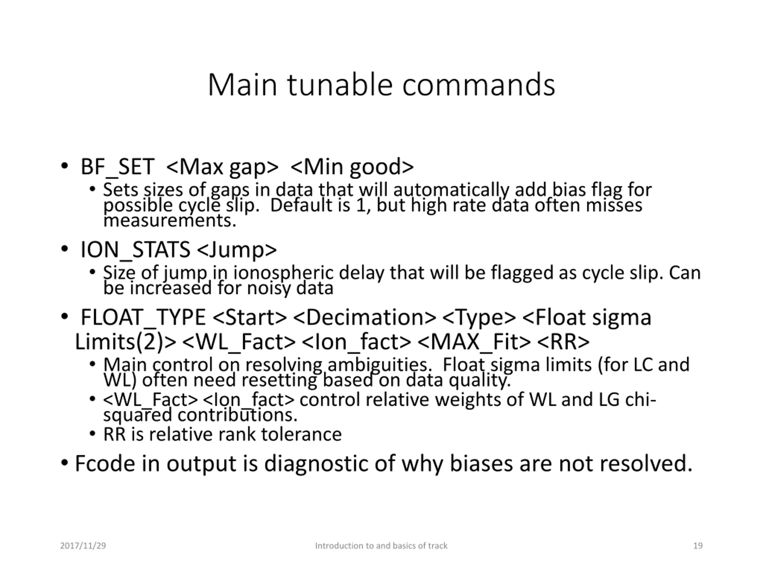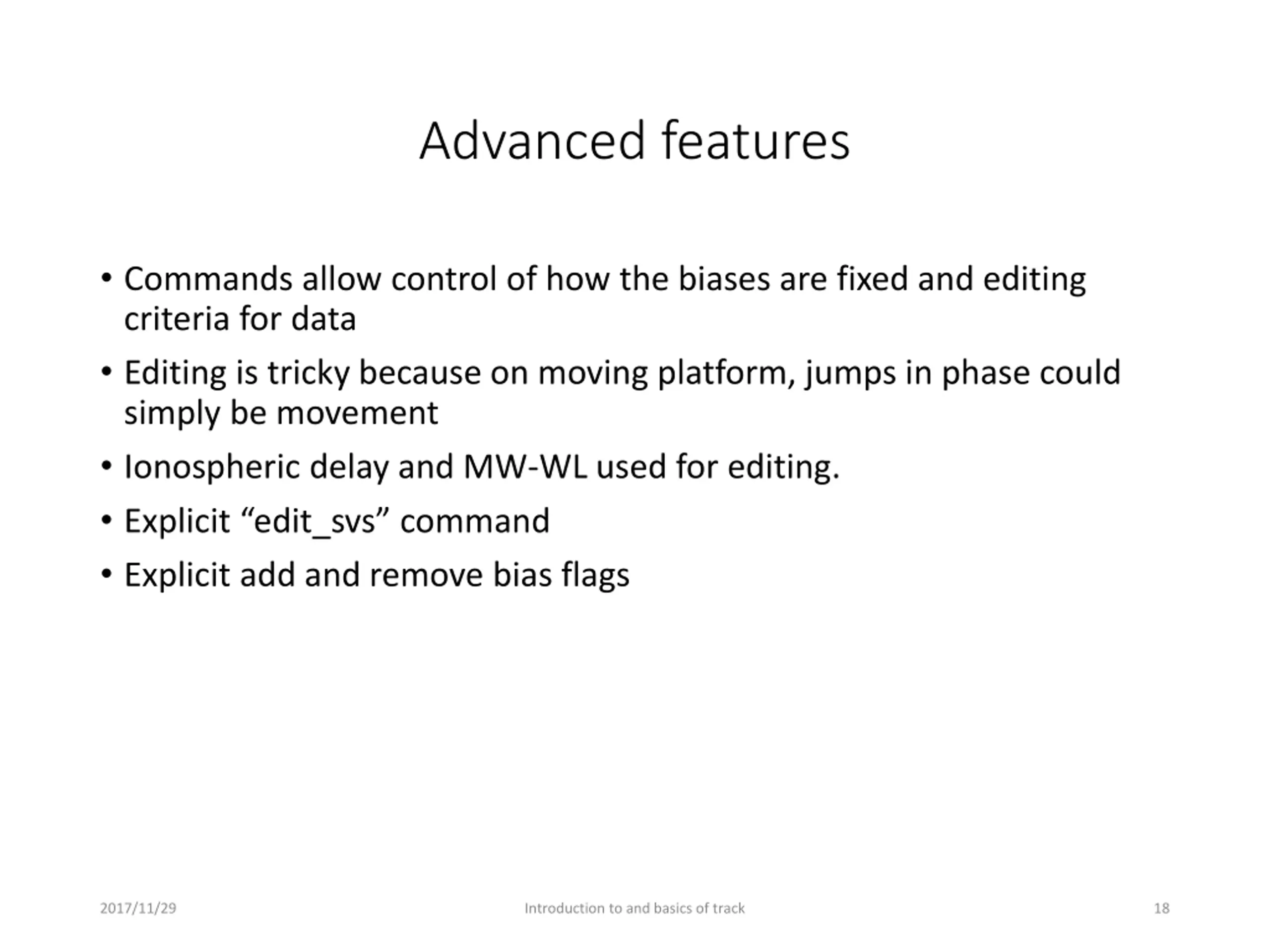 Advanced features Commands allow control of how the biases are fixed and editing criteria for data Editing is tricky because on moving platform, jumps in phase could simply be movement Ionospheric delay and MW-WL used for editing. Explicit edit_svs command Explicit add and remove bias flags 2017/11/29 Introduction to and basics of track 18