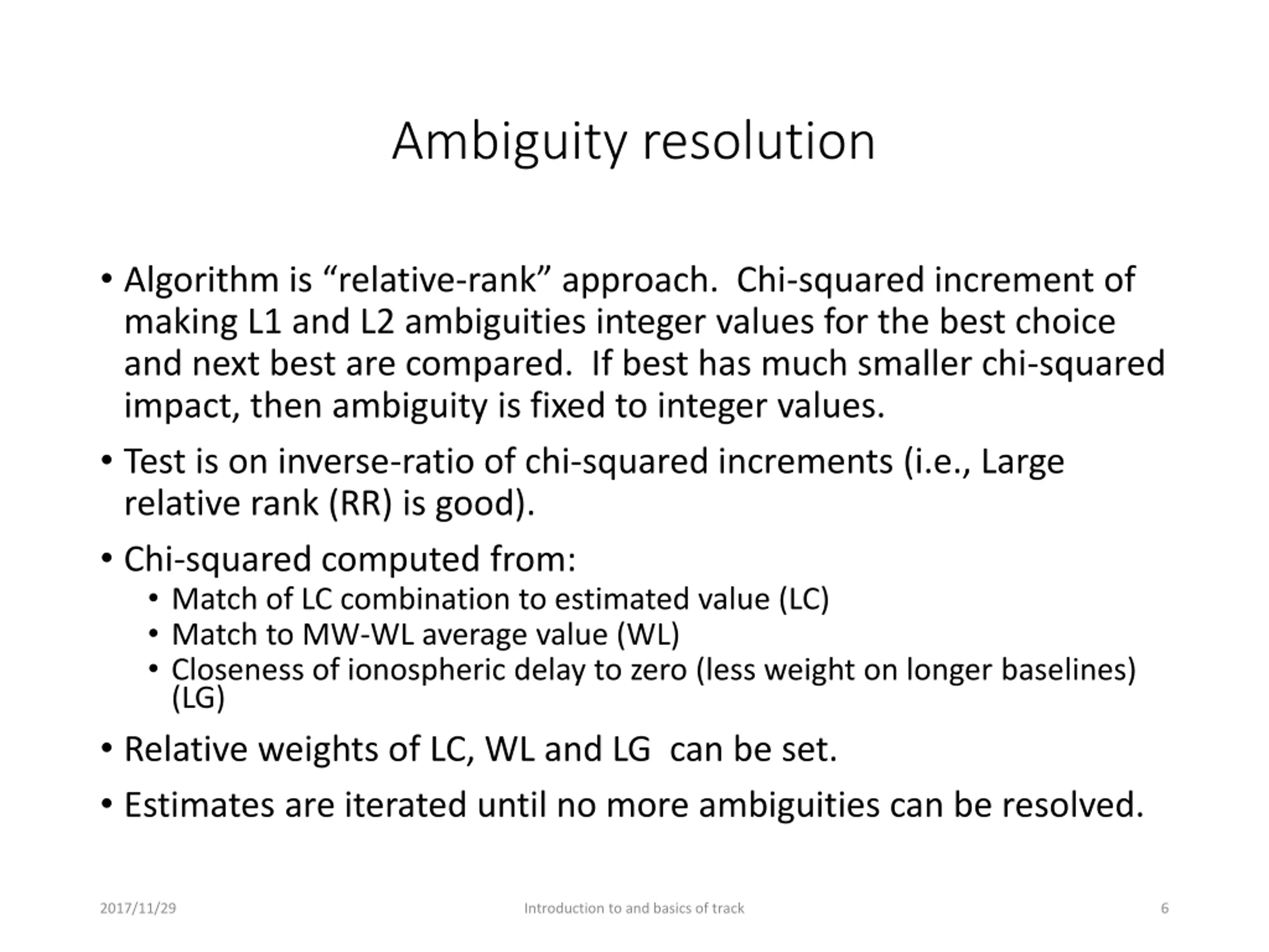 Ambiguity resolution Algorithm is relative-rank approach. Chi-squared increment of making L1 and L2 ambiguities integer values for the best choice and next best are compared. If best has much smaller chi-squared impact, then ambiguity is fixed to integer values. Test is on inverse-ratio of chi-squared increments (i.e., Large relative rank (RR) is good). Chi-squared computed from: Match of LC combination to estimated value (LC) Match to MW-WL average value (WL) Closeness of ionospheric delay to zero (less weight on longer baselines) (LG) Relative weights of LC, WL and LG can be set. Estimates are iterated until no more ambiguities can be resolved. 2017/11/29 Introduction to and basics of track 6