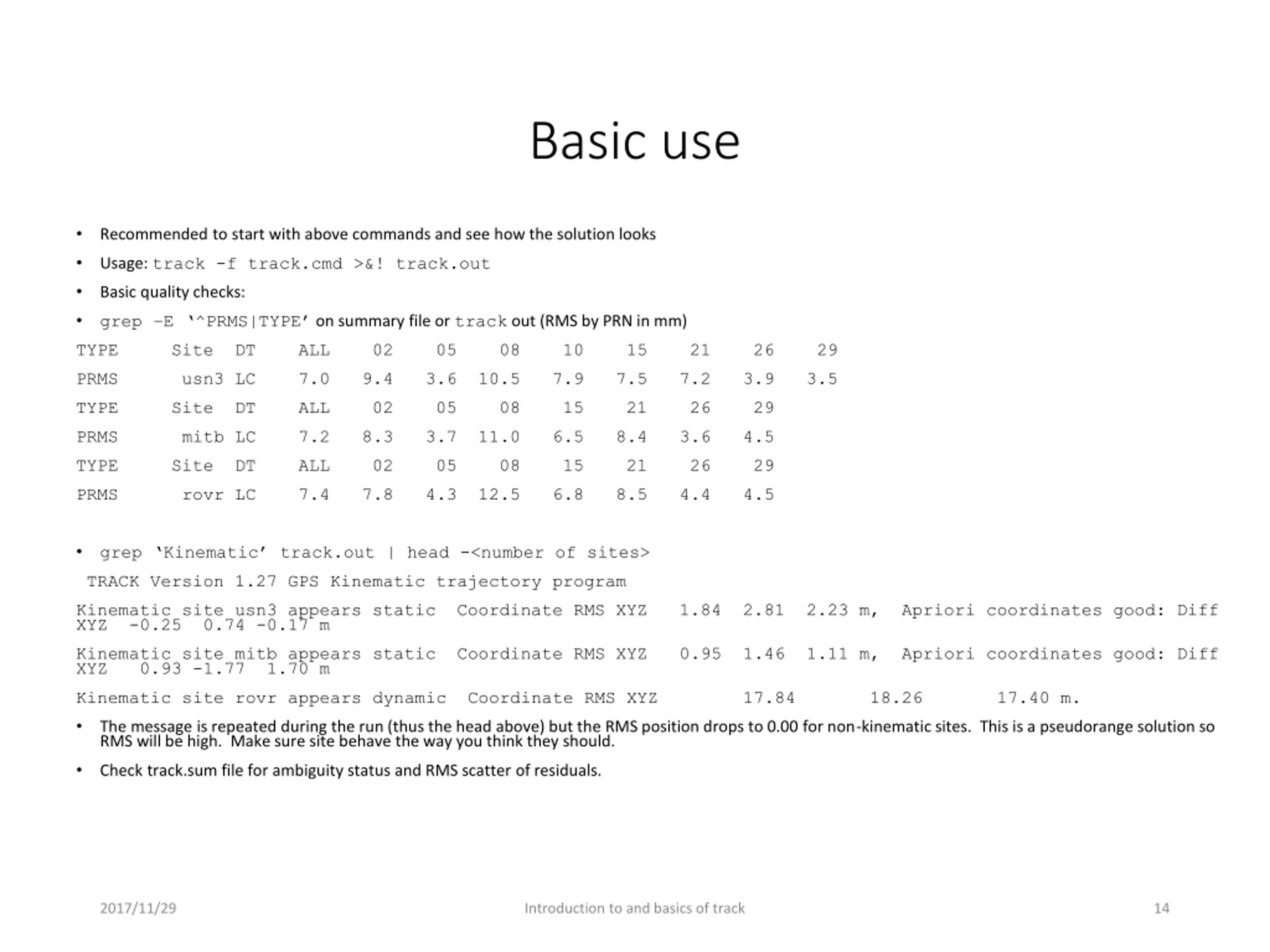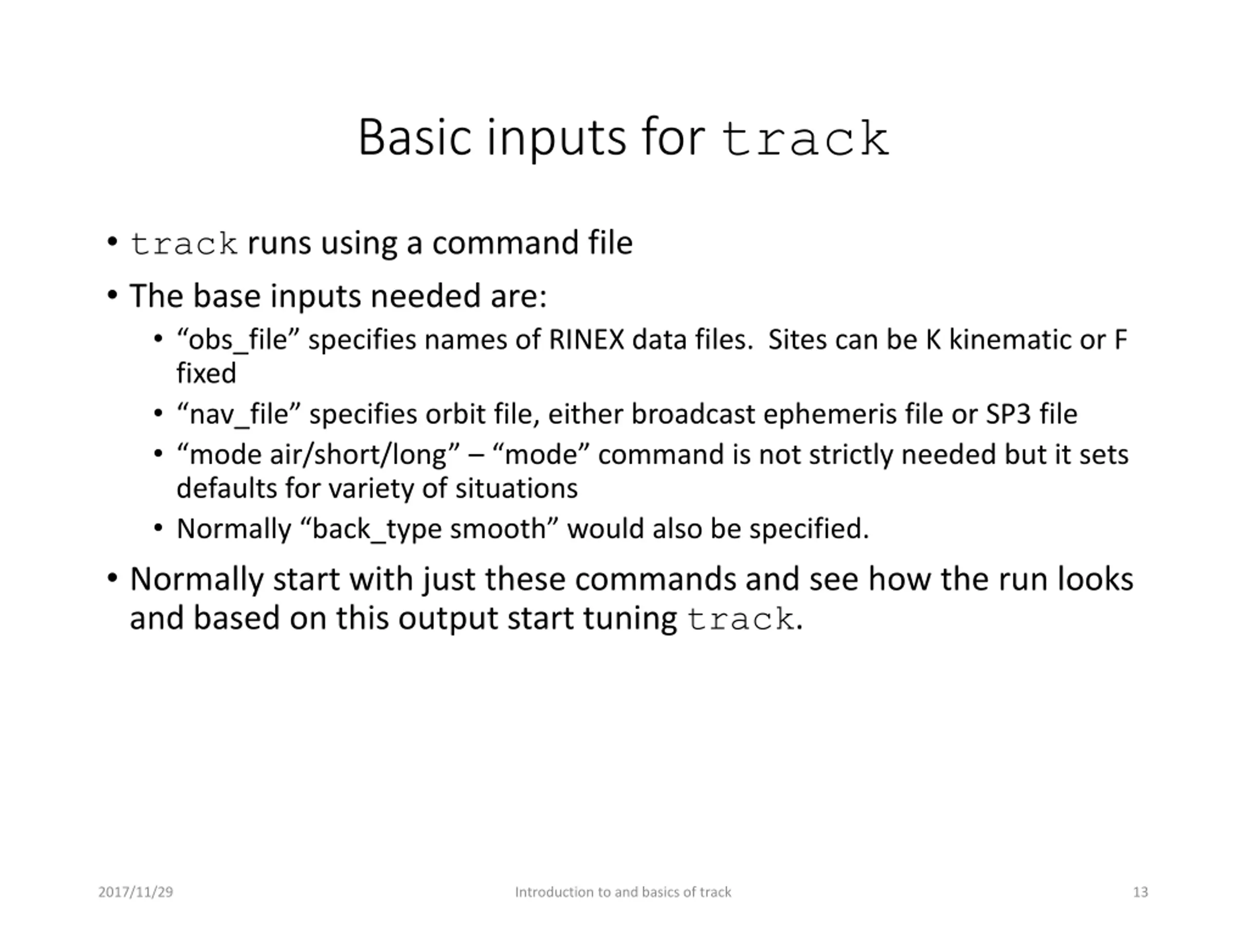 Basic inputs for track track runs using a command file The base inputs needed are: obs_file specifies names of RINEX data files. Sites can be K kinematic or F fixed nav_file specifies orbit file, either broadcast ephemeris file or SP3 file mode air/short/long mode command is not strictly needed but it sets defaults for variety of situations Normally back_type smooth would also be specified. Normally start with just these commands and see how the run looks and based on this output start tuning track. 2017/11/29 Introduction to and basics of track 13