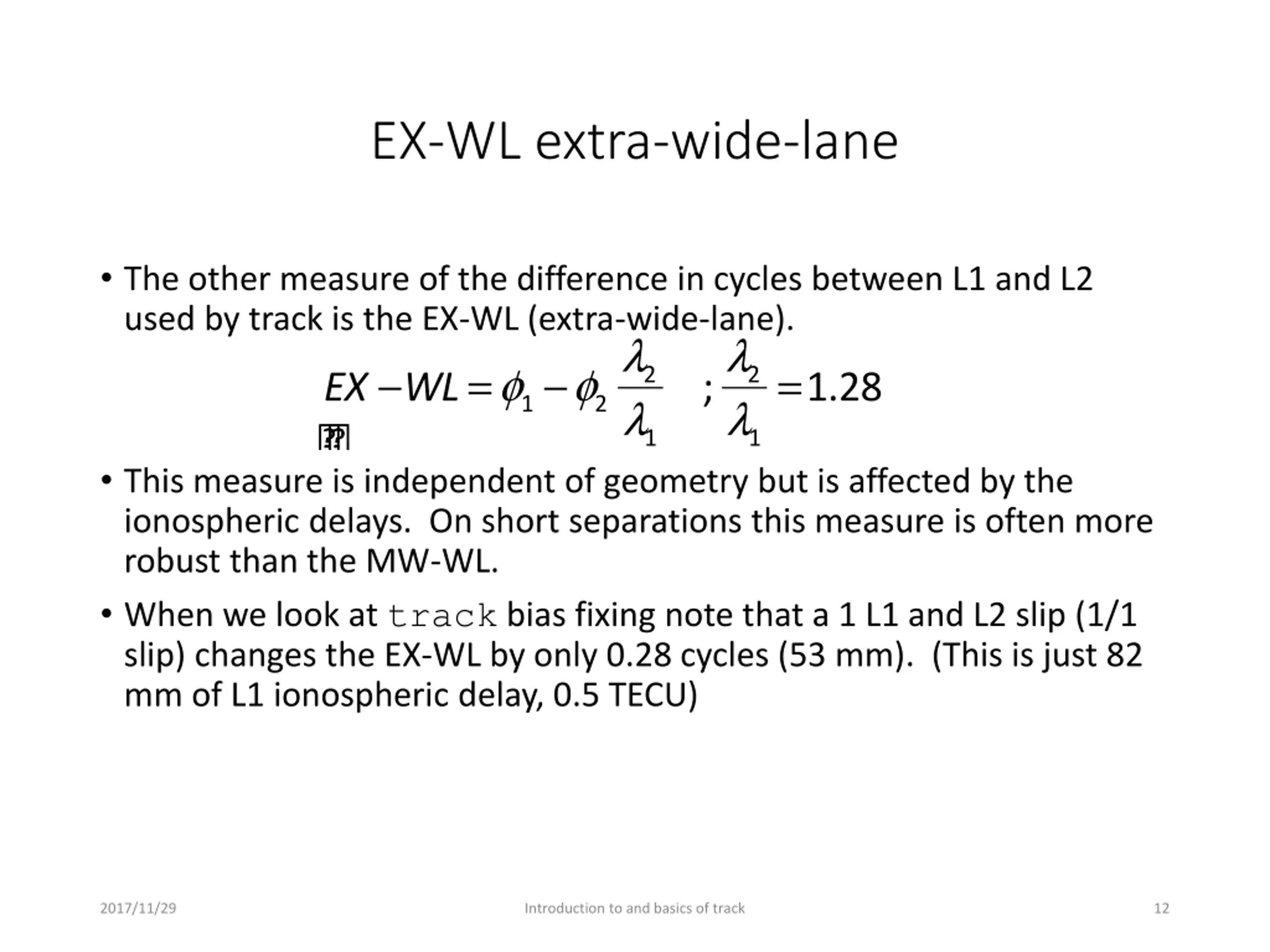 EX-WL extra-wide-lane The other measure of the difference in cycles between L1 and L2 used by track is the EX-WL (extra-wide-lane). EX -WL=f1-f2 l2 l1 ;l2 l1 =1.28 ? ? ? ? This measure is independent of geometry but is affected by the ionospheric delays. On short separations this measure is often more robust than the MW-WL. When we look at track bias fixing note that a 1 L1 and L2 slip (1/1 slip) changes the EX-WL by only 0.28 cycles (53 mm). (This is just 82 mm of L1 ionospheric delay, 0.5 TECU) 2017/11/29 Introduction to and basics of track 12