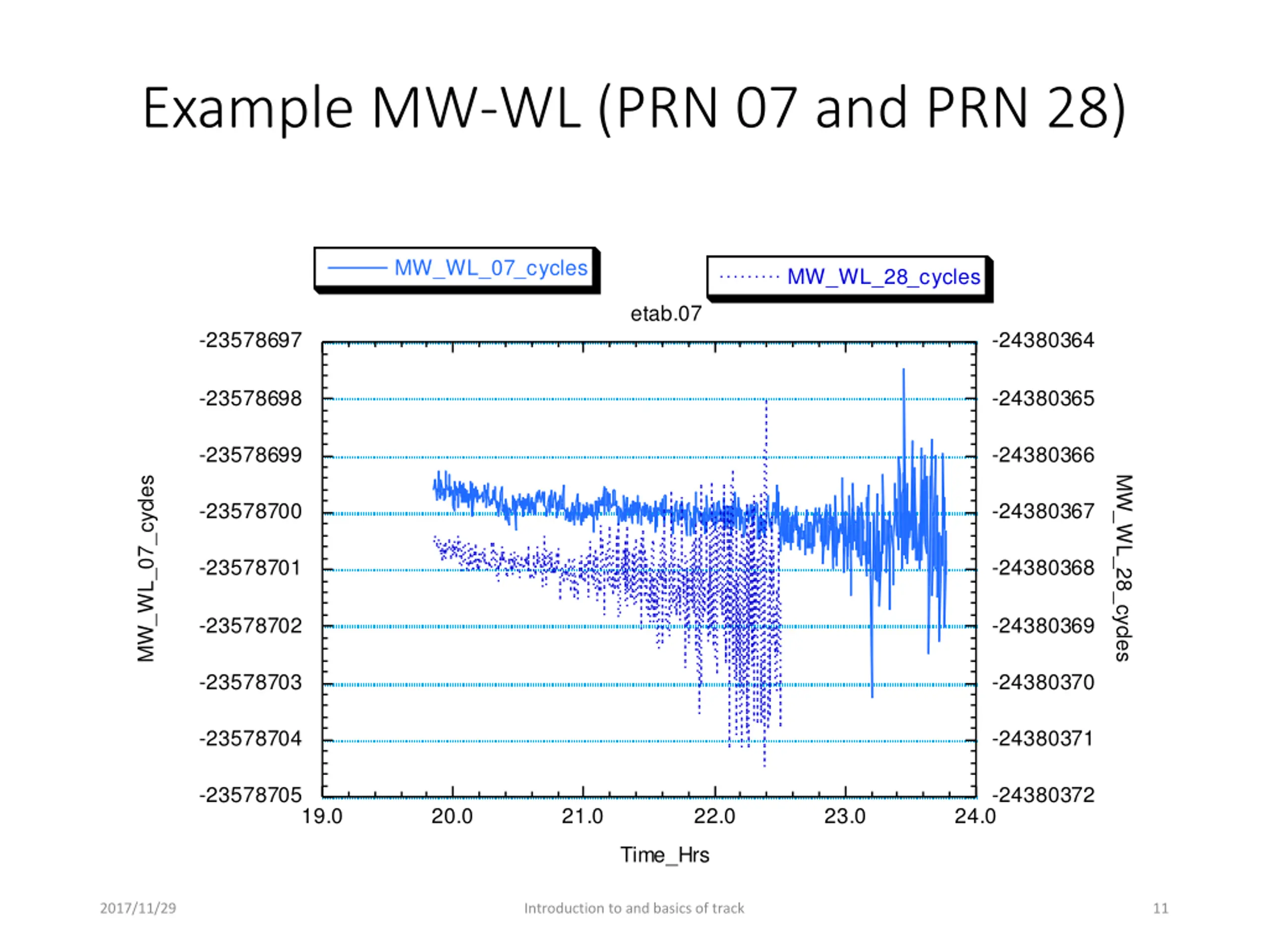 Example MW-WL (PRN 07 and PRN 28) MW_WL_07_cycles MW_WL_28_cycles etab.07 -23578697 -24380364 -23578698 -24380365 -23578699 -24380366 MW_WL_28_cycles MW_WL_07_cycles -23578700 -24380367 -23578701 -24380368 -23578702 -24380369 -23578703 -24380370 -23578704 -24380371 -23578705 -24380372 24.0 19.0 20.0 21.0 22.0 23.0 Time_Hrs 2017/11/29 Introduction to and basics of track 11
