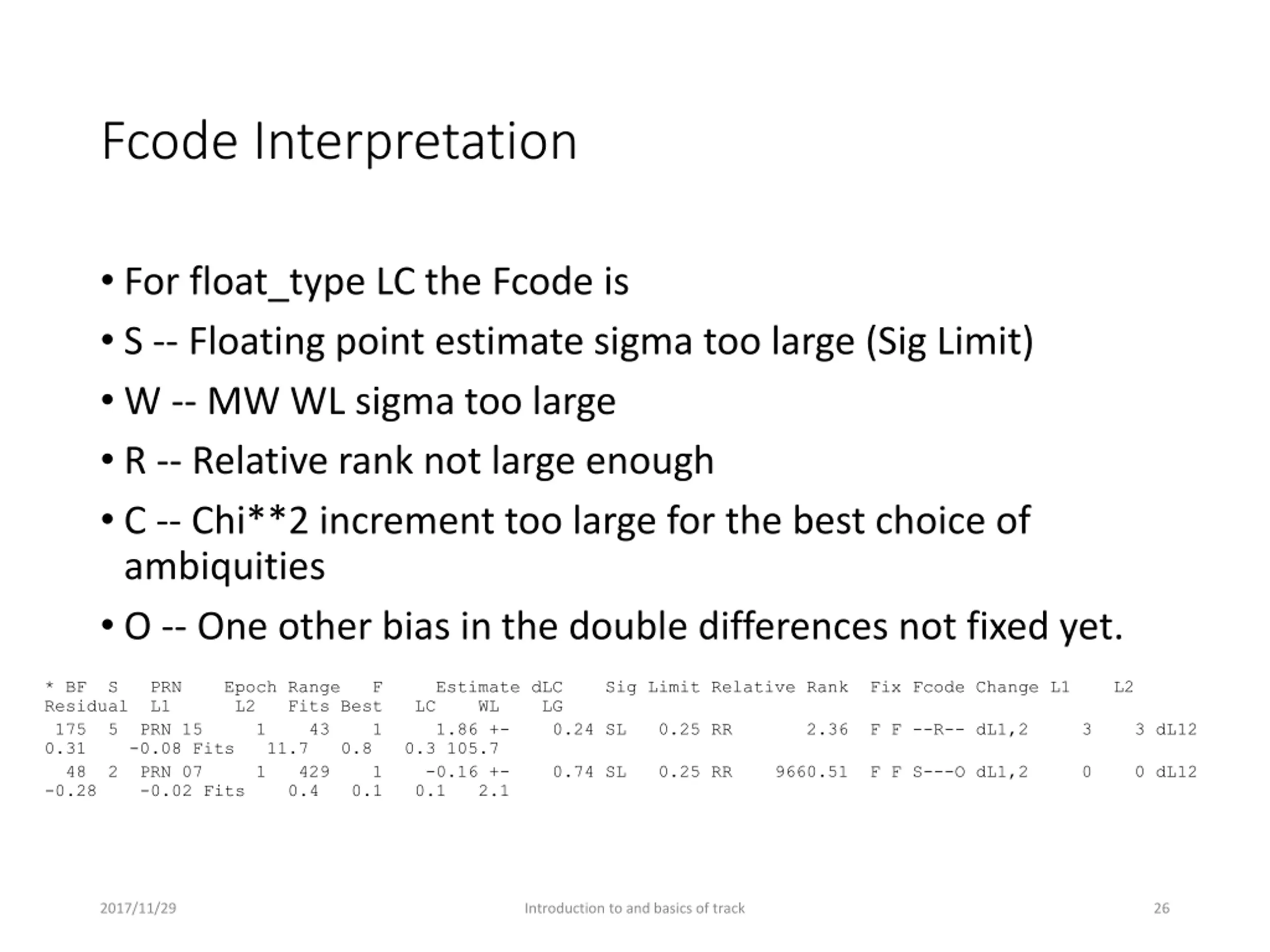 Fcode Interpretation For float_type LC the Fcode is S -- Floating point estimate sigma too large (Sig Limit) W -- MW WL sigma too large R -- Relative rank not large enough C -- Chi**2 increment too large for the best choice of ambiquities O -- One other bias in the double differences not fixed yet. * BF S PRN Epoch Range F Estimate dLC Sig Limit Relative Rank Fix Fcode Change L1 L2 Residual L1 L2 Fits Best LC WL LG 175 5 PRN 15 1 43 1 1.86 +- 0.24 SL 0.25 RR 2.36 F F --R-- dL1,2 3 3 dL12 0.31 -0.08 Fits 11.7 0.8 0.3 105.7 48 2 PRN 07 1 429 1 -0.16 +- 0.74 SL 0.25 RR 9660.51 F F S---O dL1,2 0 0 dL12 -0.28 -0.02 Fits 0.4 0.1 0.1 2.1 2017/11/29 Introduction to and basics of track 26