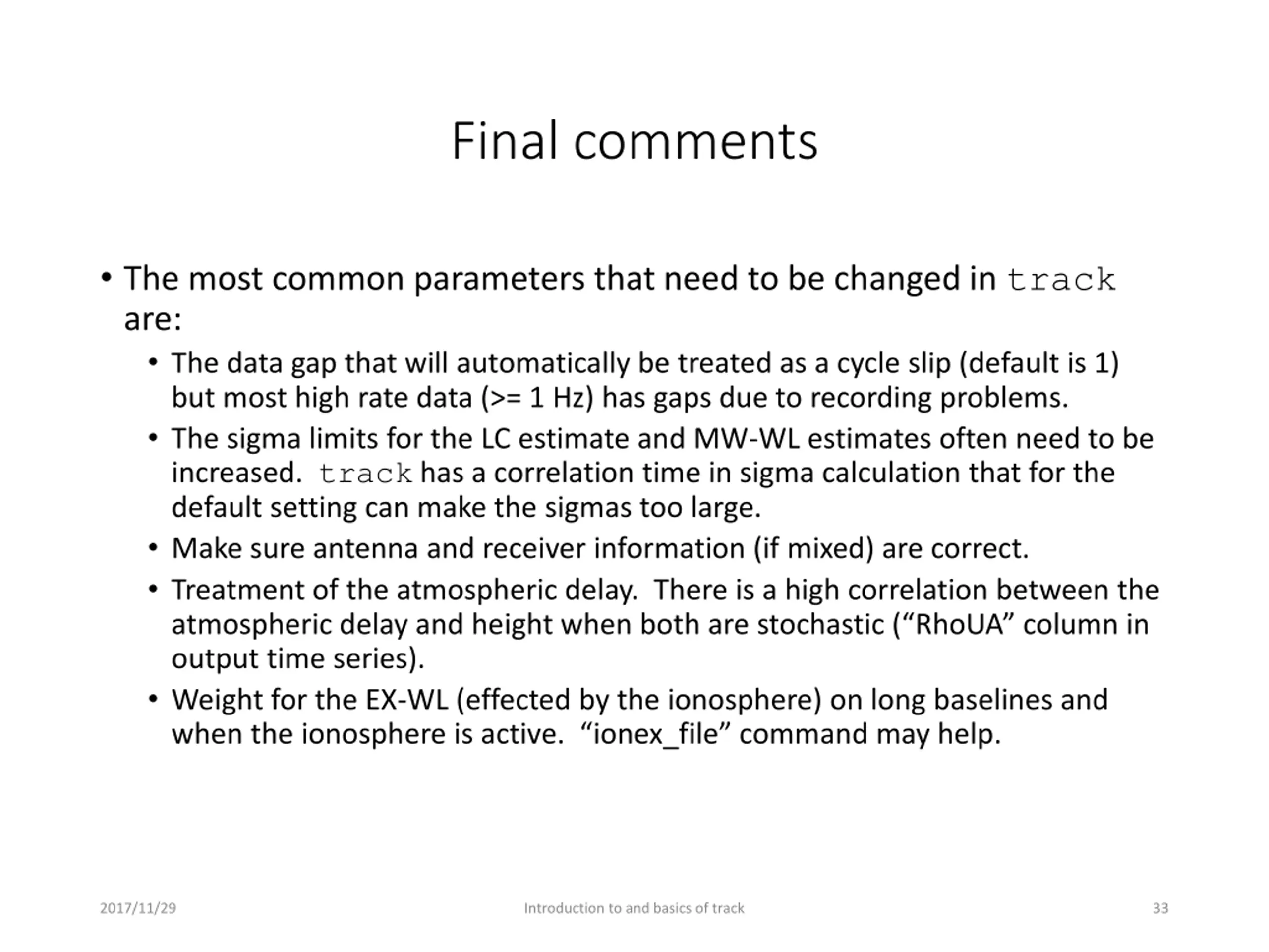 Final comments The most common parameters that need to be changed in track are: The data gap that will automatically be treated as a cycle slip (default is 1) but most high rate data (>= 1 Hz) has gaps due to recording problems. The sigma limits for the LC estimate and MW-WL estimates often need to be increased. track has a correlation time in sigma calculation that for the default setting can make the sigmas too large. Make sure antenna and receiver information (if mixed) are correct. Treatment of the atmospheric delay. There is a high correlation between the atmospheric delay and height when both are stochastic ( RhoUA column in output time series). Weight for the EX-WL (effected by the ionosphere) on long baselines and when the ionosphere is active. ionex_file command may help. 2017/11/29 Introduction to and basics of track 33