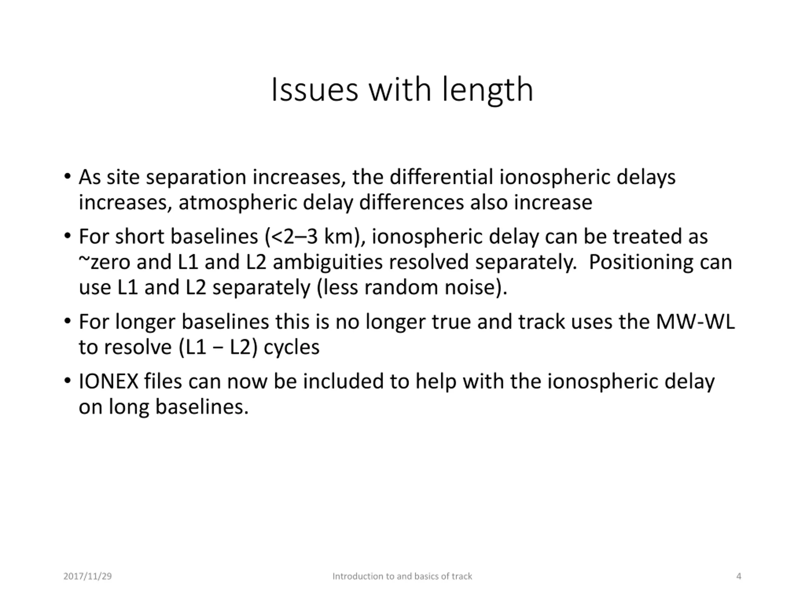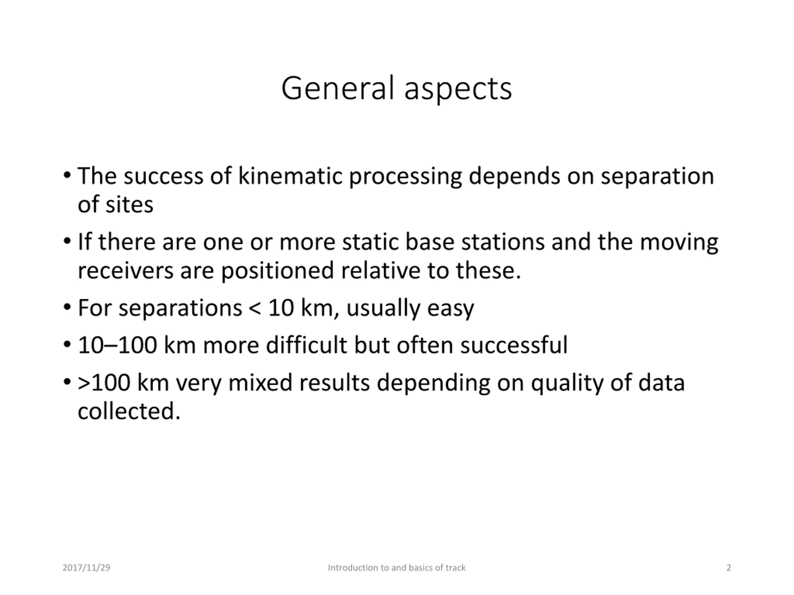 General aspects The success of kinematic processing depends on separation of sites If there are one or more static base stations and the moving receivers are positioned relative to these. For separations < 10 km, usually easy 10 100 km more difficult but often successful >100 km very mixed results depending on quality of data collected. 2017/11/29 Introduction to and basics of track 2