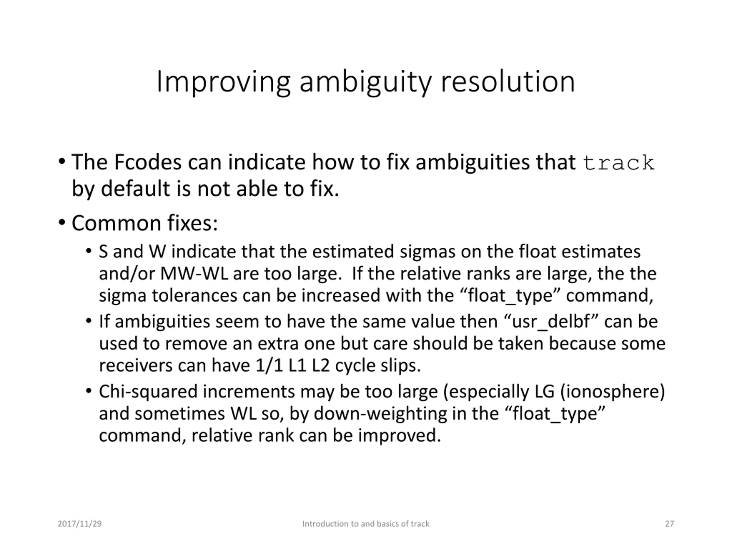 Improving ambiguity resolution The Fcodes can indicate how to fix ambiguities that track by default is not able to fix. Common fixes: S and W indicate that the estimated sigmas on the float estimates and/or MW-WL are too large. If the relative ranks are large, the the sigma tolerances can be increased with the float_type command, If ambiguities seem to have the same value then usr_delbf can be used to remove an extra one but care should be taken because some receivers can have 1/1 L1 L2 cycle slips. Chi-squared increments may be too large (especially LG (ionosphere) and sometimes WL so, by down-weighting in the float_type command, relative rank can be improved. 2017/11/29 Introduction to and basics of track 27