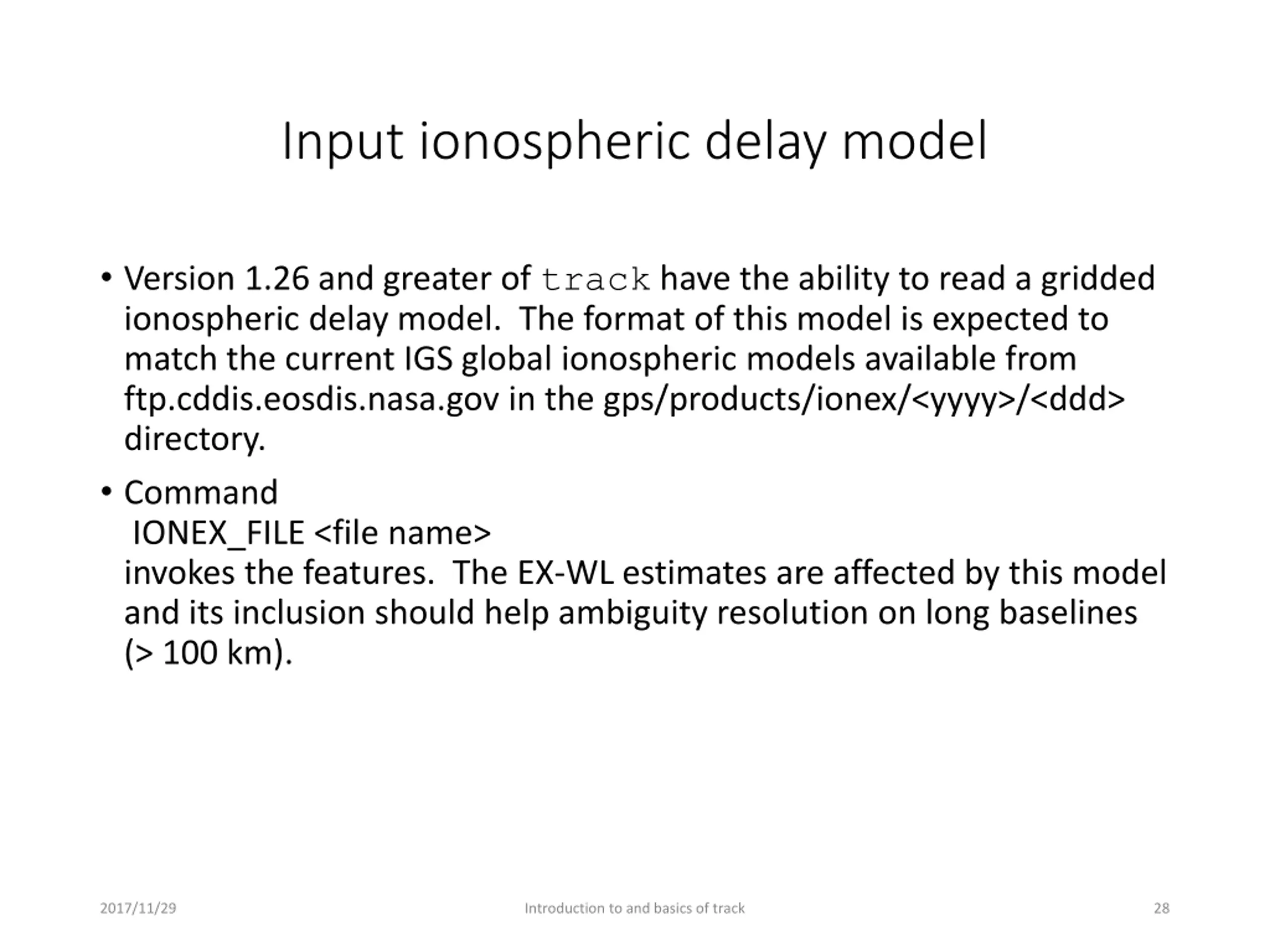 Input ionospheric delay model Version 1.26 and greater of track have the ability to read a gridded ionospheric delay model. The format of this model is expected to match the current IGS global ionospheric models available from ftp.cddis.eosdis.nasa.gov in the gps/products/ionex/<yyyy>/<ddd> directory. Command IONEX_FILE <file name> invokes the features. The EX-WL estimates are affected by this model and its inclusion should help ambiguity resolution on long baselines (> 100 km). 2017/11/29 Introduction to and basics of track 28
