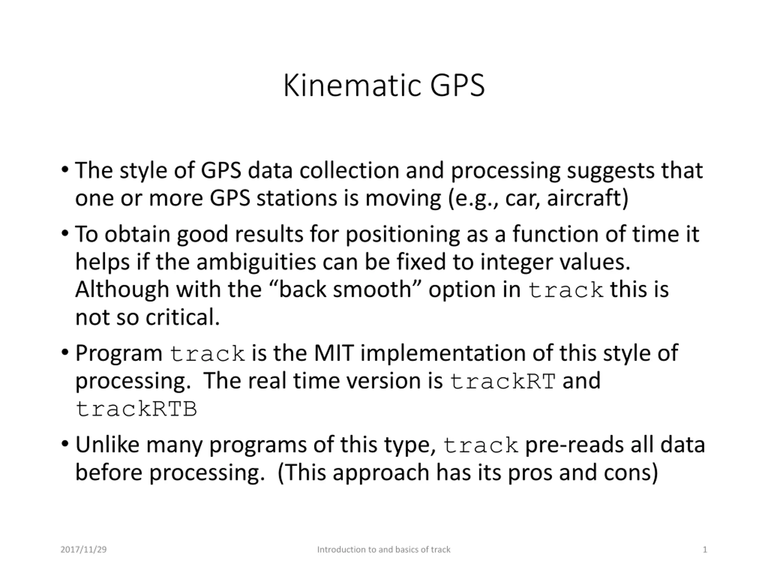 Kinematic GPS The style of GPS data collection and processing suggests that one or more GPS stations is moving (e.g., car, aircraft) To obtain good results for positioning as a function of time it helps if the ambiguities can be fixed to integer values. Although with the back smooth option in track this is not so critical. Program track is the MIT implementation of this style of processing. The real time version is trackRT and trackRTB Unlike many programs of this type, track pre-reads all data before processing. (This approach has its pros and cons) 2017/11/29 Introduction to and basics of track 1