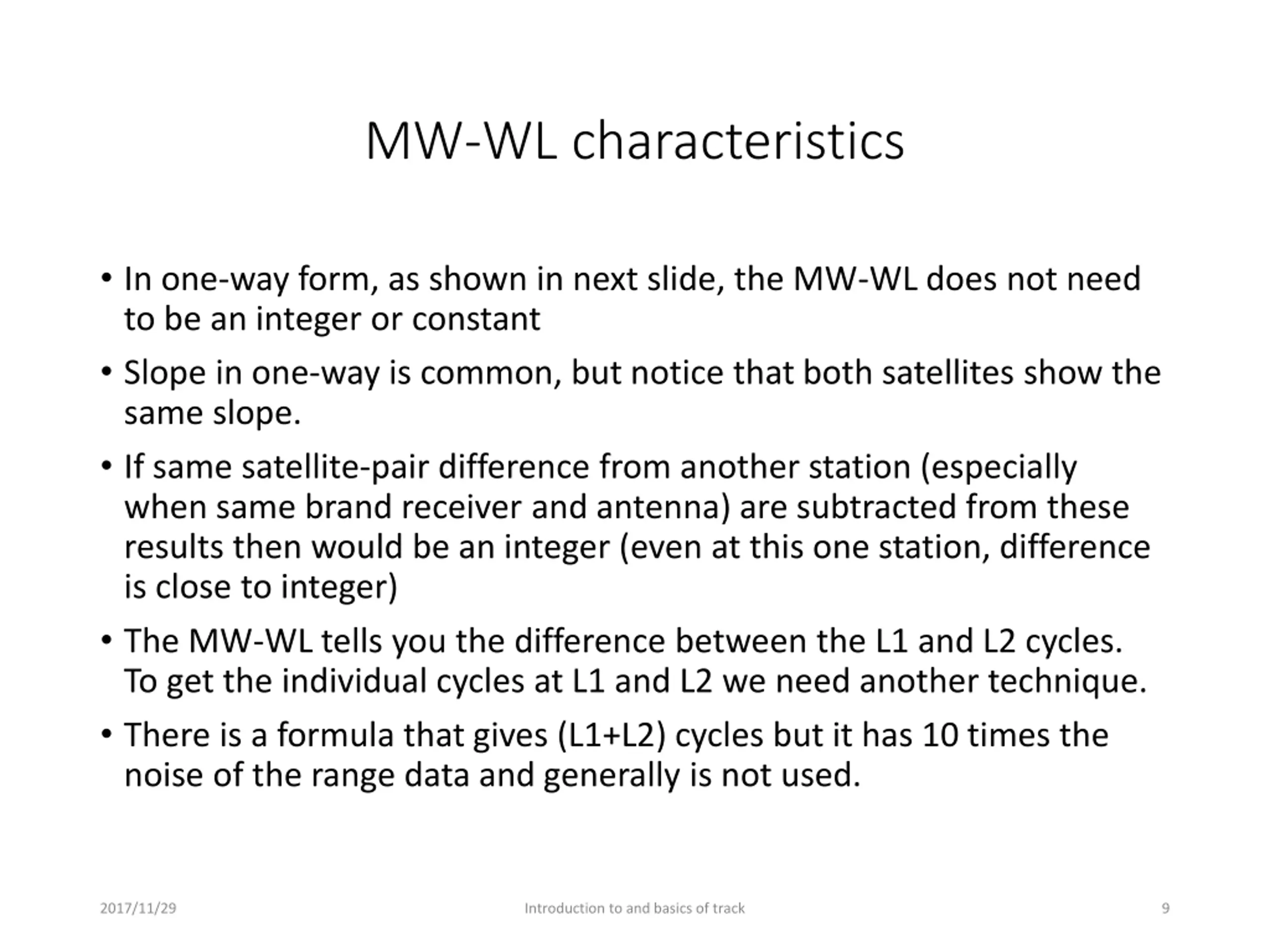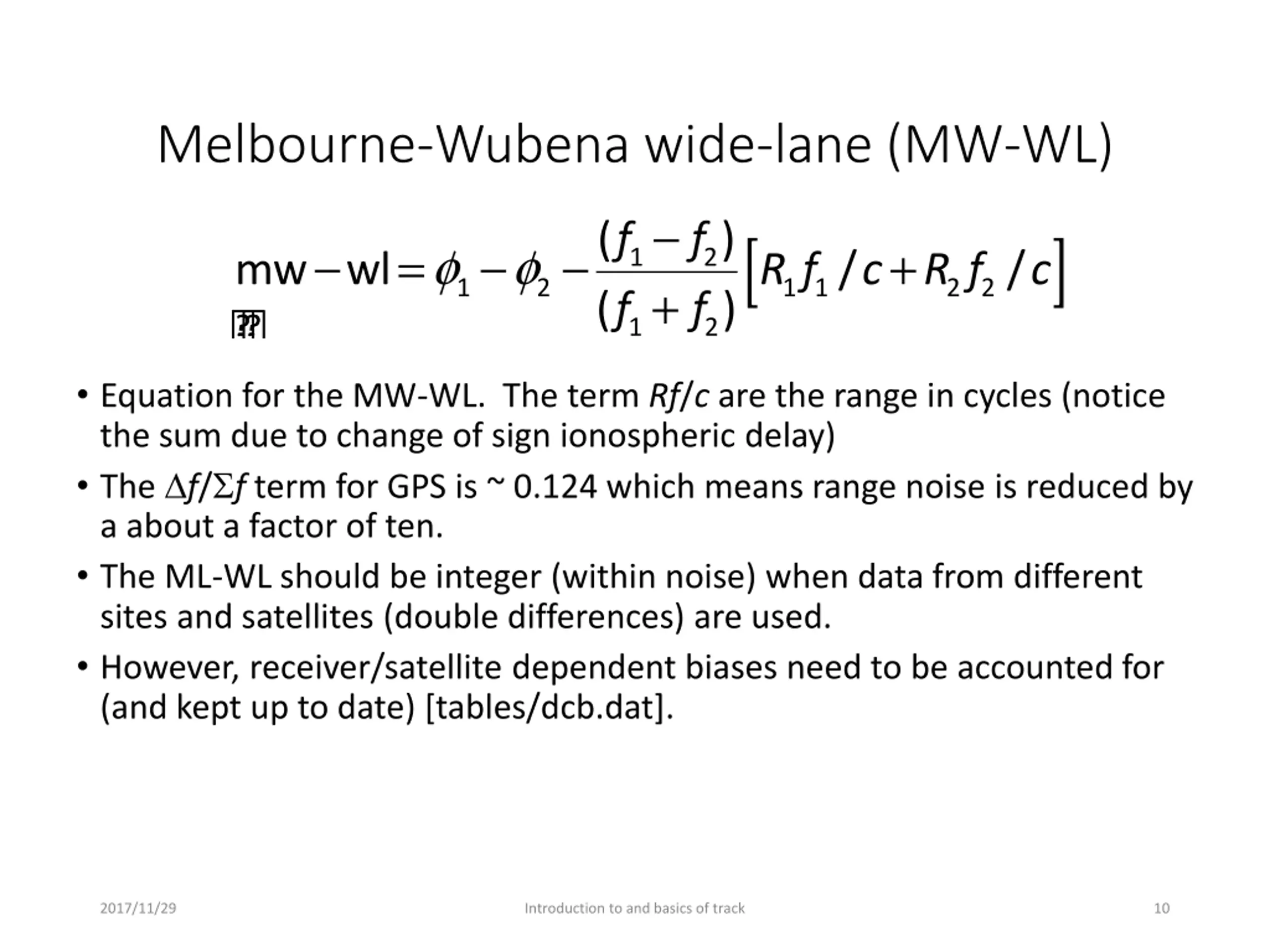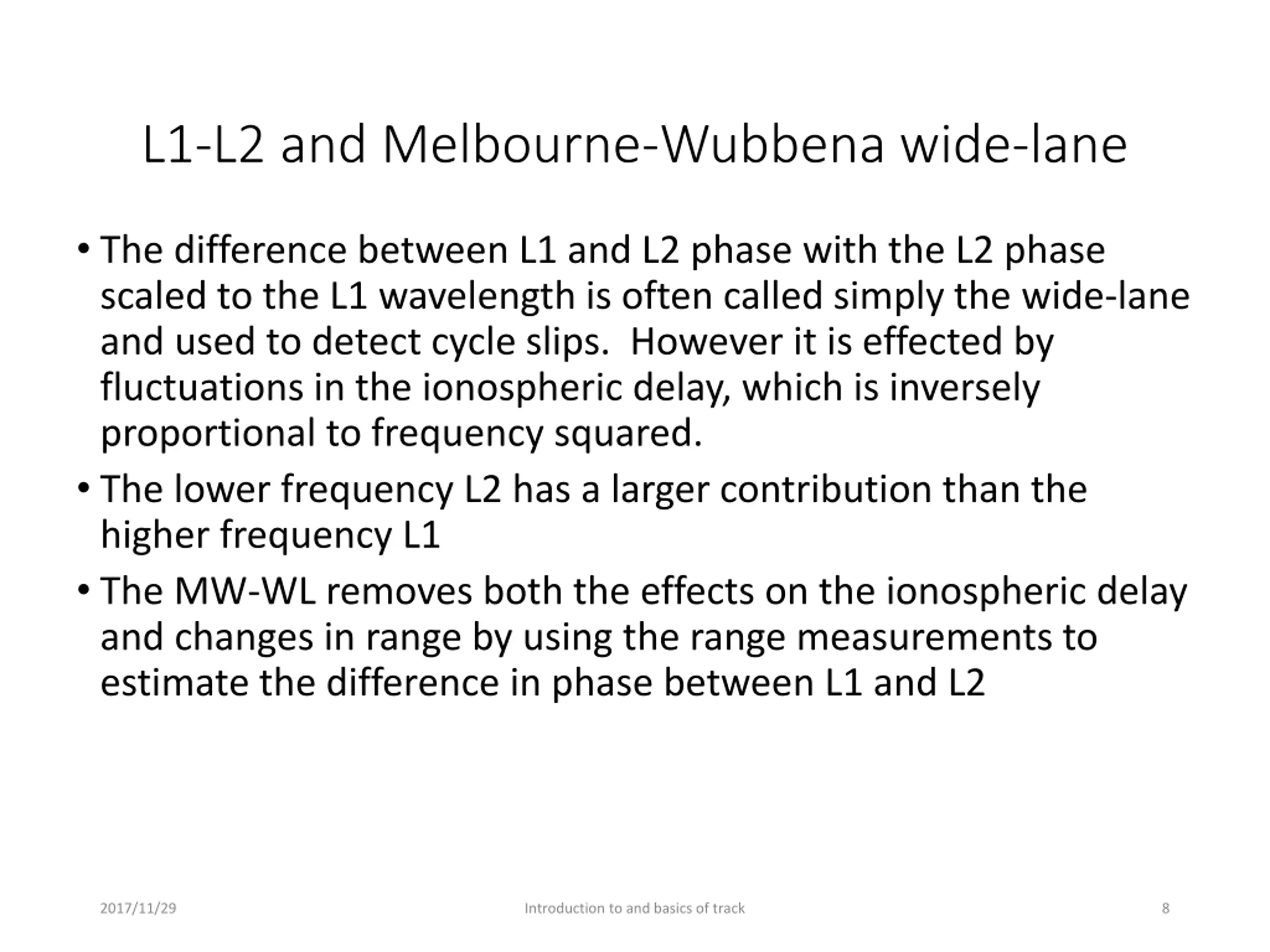 L1-L2 and Melbourne-Wubbena wide-lane The difference between L1 and L2 phase with the L2 phase scaled to the L1 wavelength is often called simply the wide-lane and used to detect cycle slips. However it is effected by fluctuations in the ionospheric delay, which is inversely proportional to frequency squared. The lower frequency L2 has a larger contribution than the higher frequency L1 The MW-WL removes both the effects on the ionospheric delay and changes in range by using the range measurements to estimate the difference in phase between L1 and L2 2017/11/29 Introduction to and basics of track 8