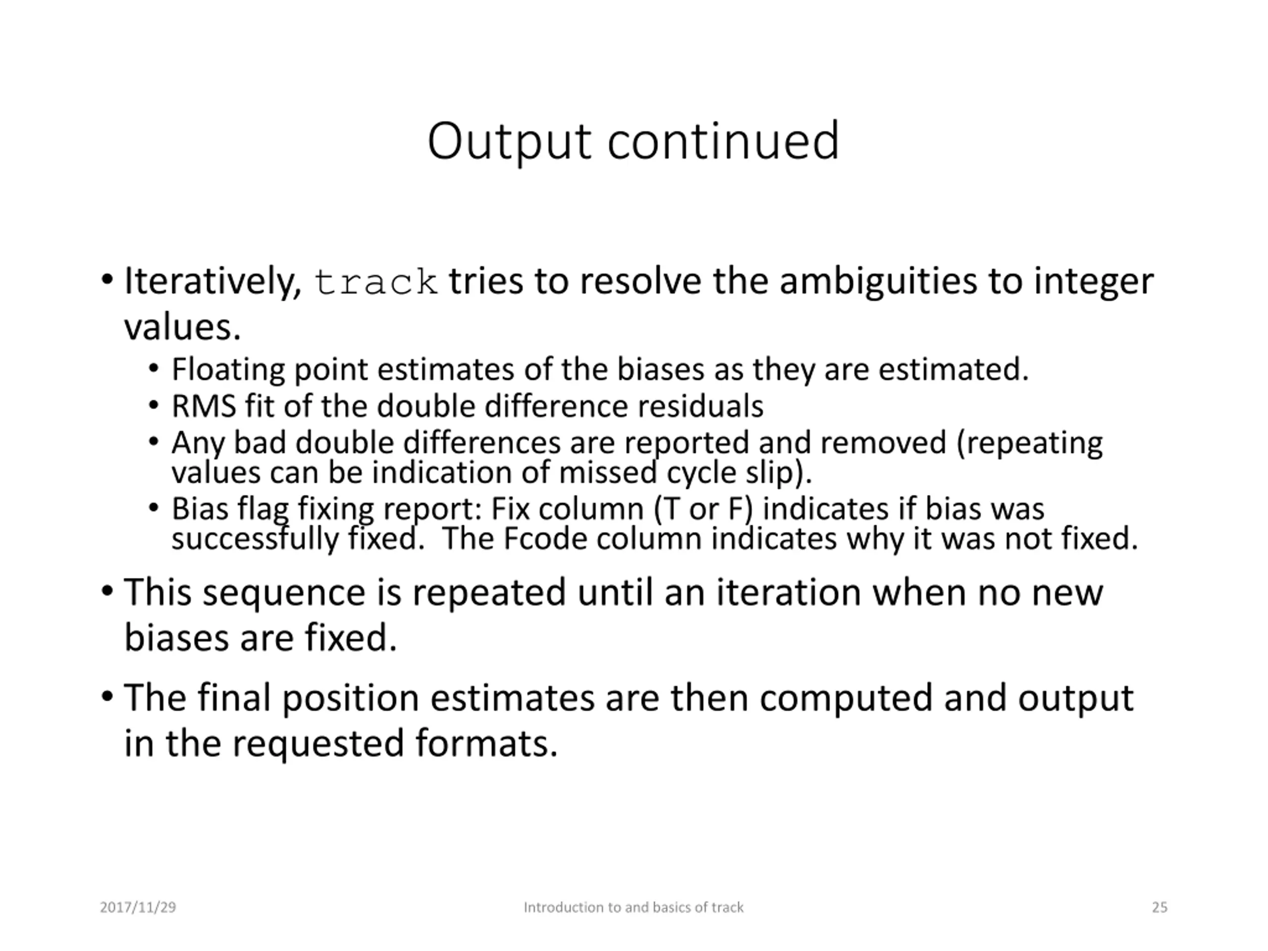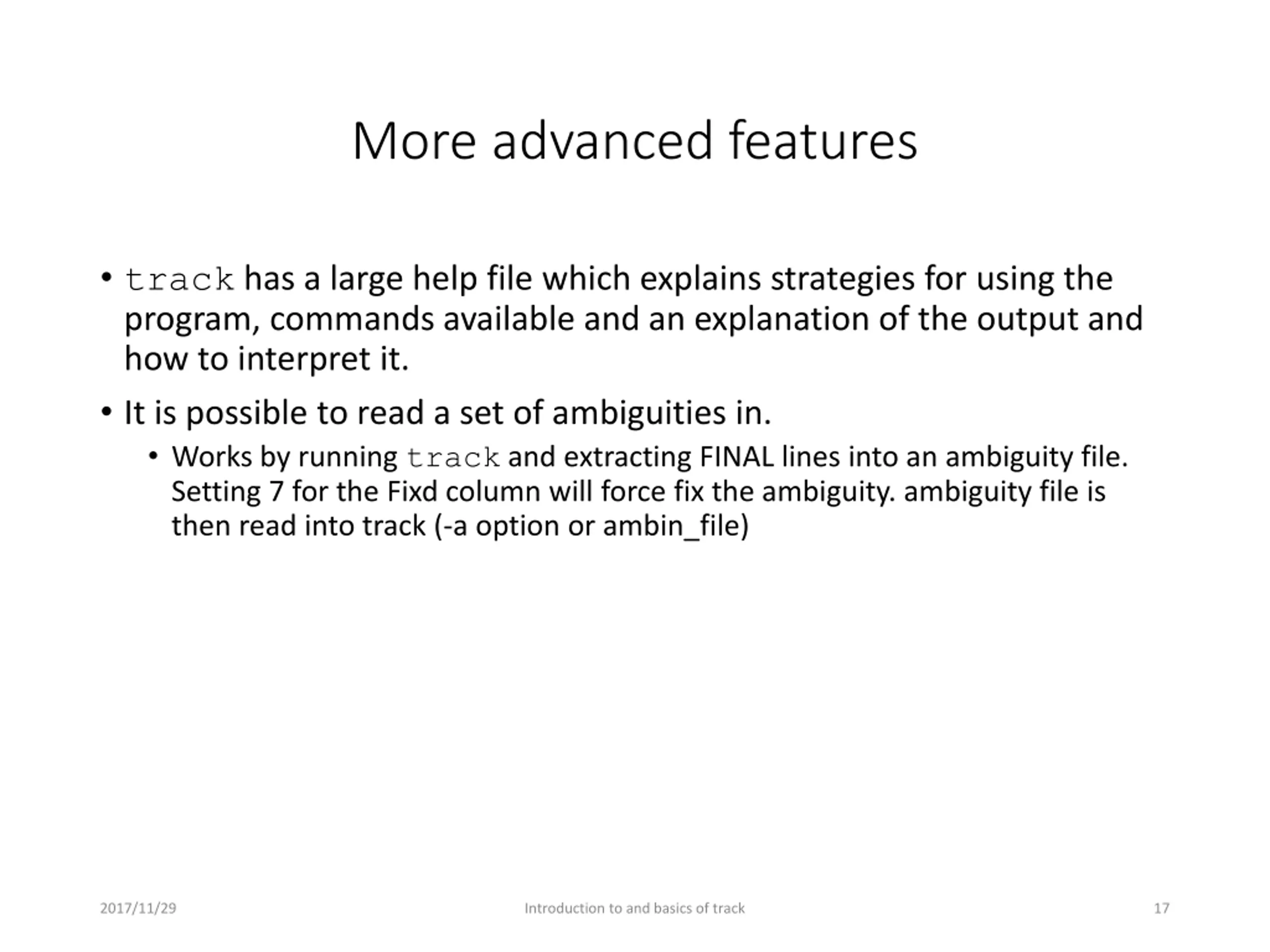 More advanced features track has a large help file which explains strategies for using the program, commands available and an explanation of the output and how to interpret it. It is possible to read a set of ambiguities in. Works by running track and extracting FINAL lines into an ambiguity file. Setting 7 for the Fixd column will force fix the ambiguity. ambiguity file is then read into track (-a option or ambin_file) 2017/11/29 Introduction to and basics of track 17