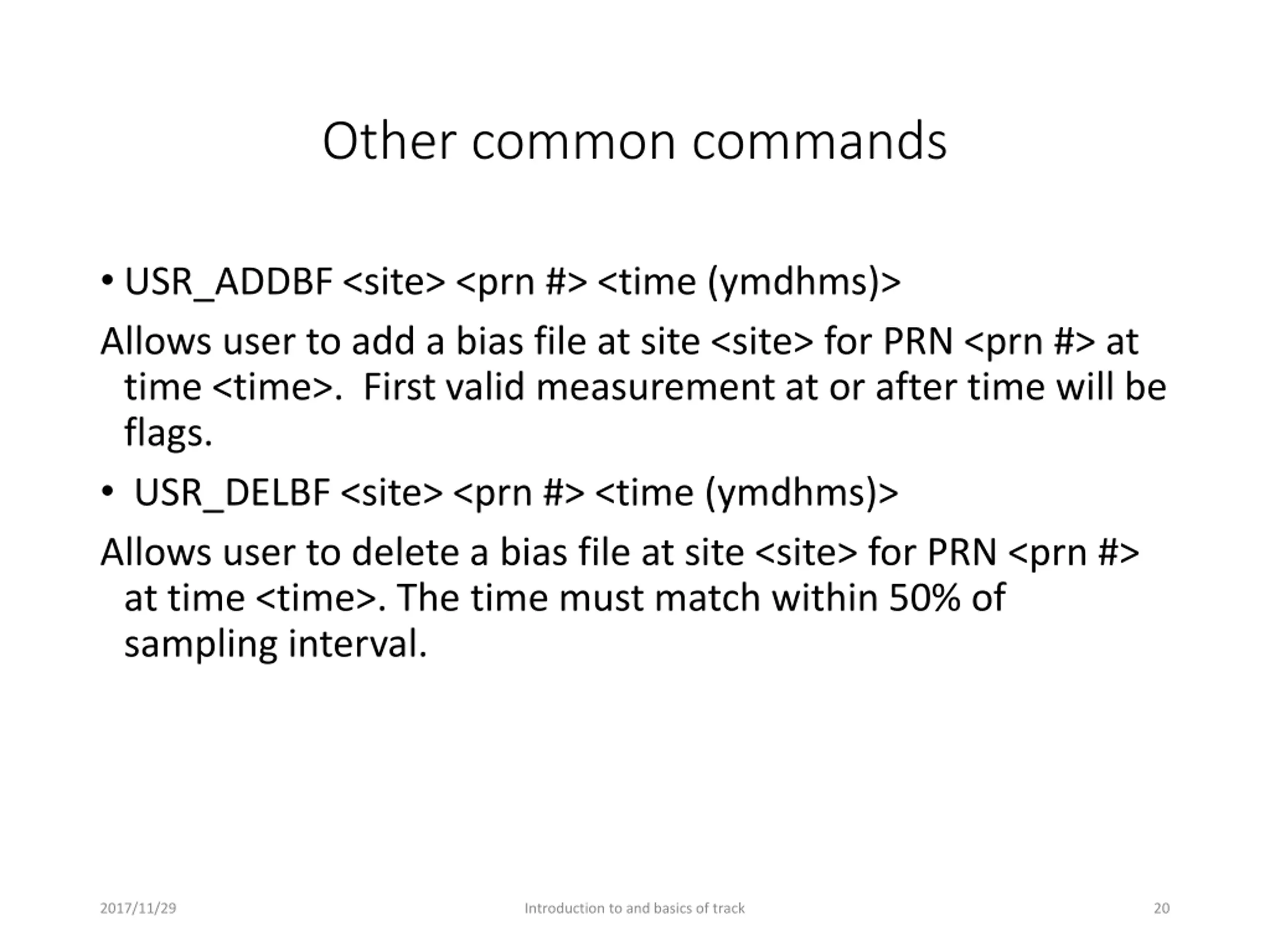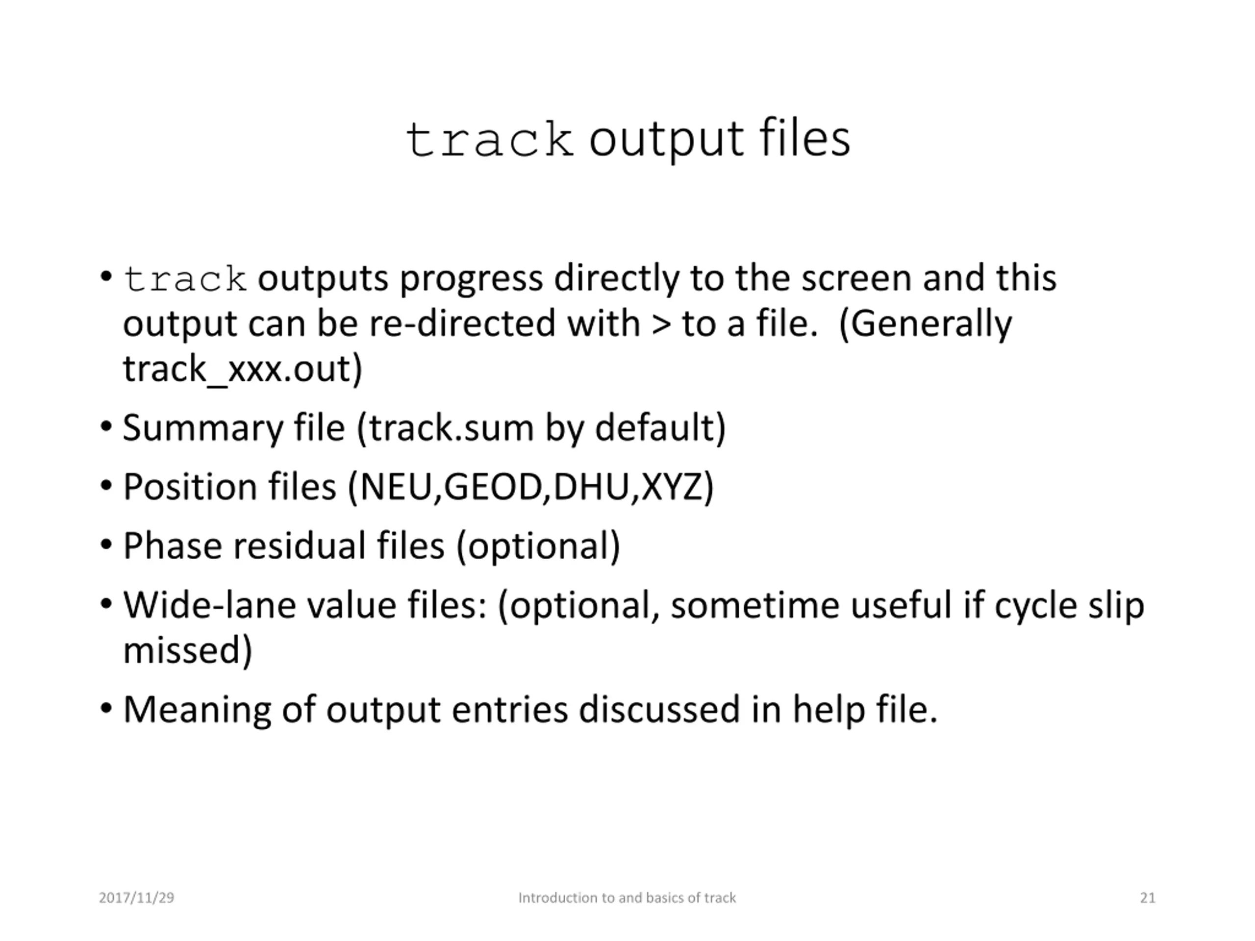 Other common commands USR_ADDBF <site> <prn #> <time (ymdhms)> Allows user to add a bias file at site <site> for PRN <prn #> at time <time>. First valid measurement at or after time will be flags. USR_DELBF <site> <prn #> <time (ymdhms)> Allows user to delete a bias file at site <site> for PRN <prn #> at time <time>. The time must match within 50% of sampling interval. 2017/11/29 Introduction to and basics of track 20