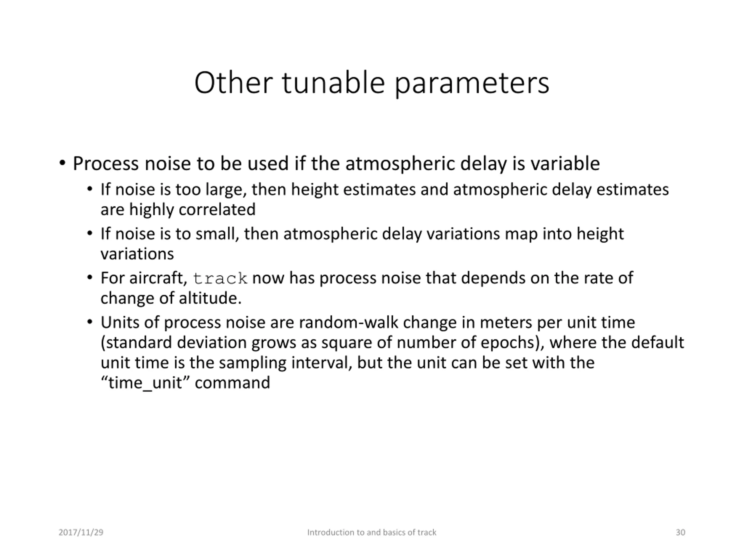 Other tunable parameters Process noise to be used if the atmospheric delay is variable If noise is too large, then height estimates and atmospheric delay estimates are highly correlated If noise is to small, then atmospheric delay variations map into height variations For aircraft, track now has process noise that depends on the rate of change of altitude. Units of process noise are random-walk change in meters per unit time (standard deviation grows as square of number of epochs), where the default unit time is the sampling interval, but the unit can be set with the time_unit command 2017/11/29 Introduction to and basics of track 30