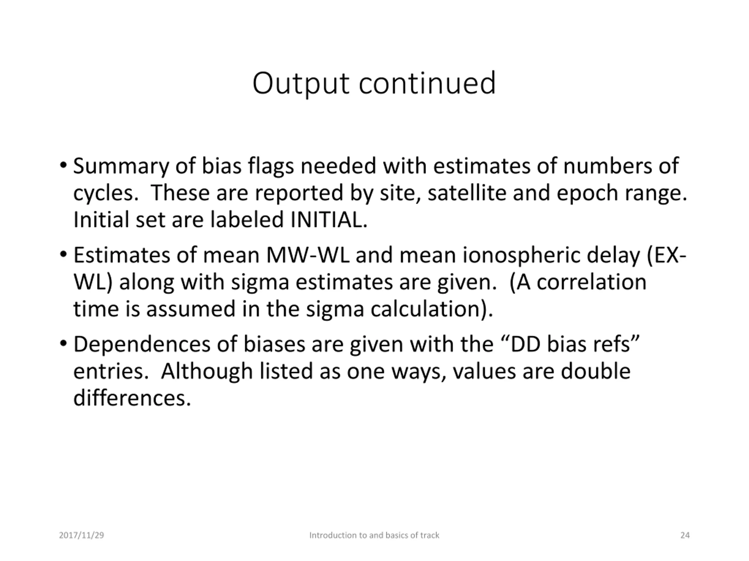 Output continued Summary of bias flags needed with estimates of numbers of cycles. These are reported by site, satellite and epoch range. Initial set are labeled INITIAL. Estimates of mean MW-WL and mean ionospheric delay (EX- WL) along with sigma estimates are given. (A correlation time is assumed in the sigma calculation). Dependences of biases are given with the DD bias refs entries. Although listed as one ways, values are double differences. 2017/11/29 Introduction to and basics of track 24