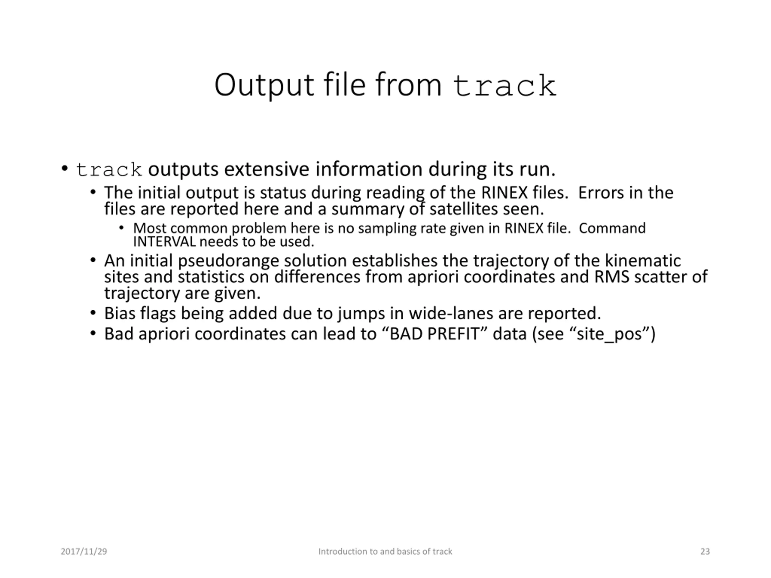 Output file from track track outputs extensive information during its run. The initial output is status during reading of the RINEX files. Errors in the files are reported here and a summary of satellites seen. Most common problem here is no sampling rate given in RINEX file. Command INTERVAL needs to be used. An initial pseudorange solution establishes the trajectory of the kinematic sites and statistics on differences from apriori coordinates and RMS scatter of trajectory are given. Bias flags being added due to jumps in wide-lanes are reported. Bad apriori coordinates can lead to BAD PREFIT data (see site_pos ) 2017/11/29 Introduction to and basics of track 23