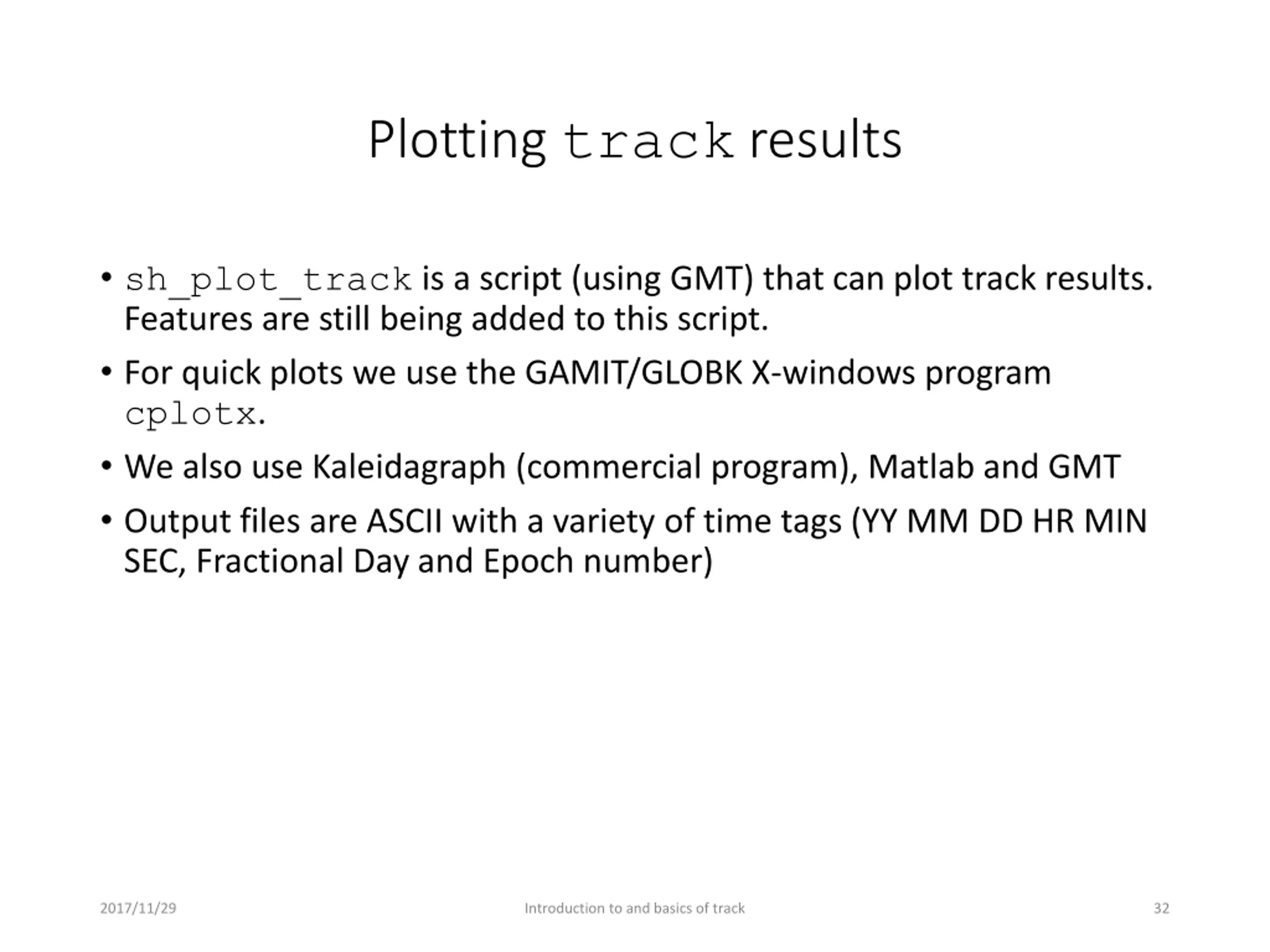 Plotting track results sh_plot_track is a script (using GMT) that can plot track results. Features are still being added to this script. For quick plots we use the GAMIT/GLOBK X-windows program cplotx. We also use Kaleidagraph (commercial program), Matlab and GMT Output files are ASCII with a variety of time tags (YY MM DD HR MIN SEC, Fractional Day and Epoch number) 2017/11/29 Introduction to and basics of track 32