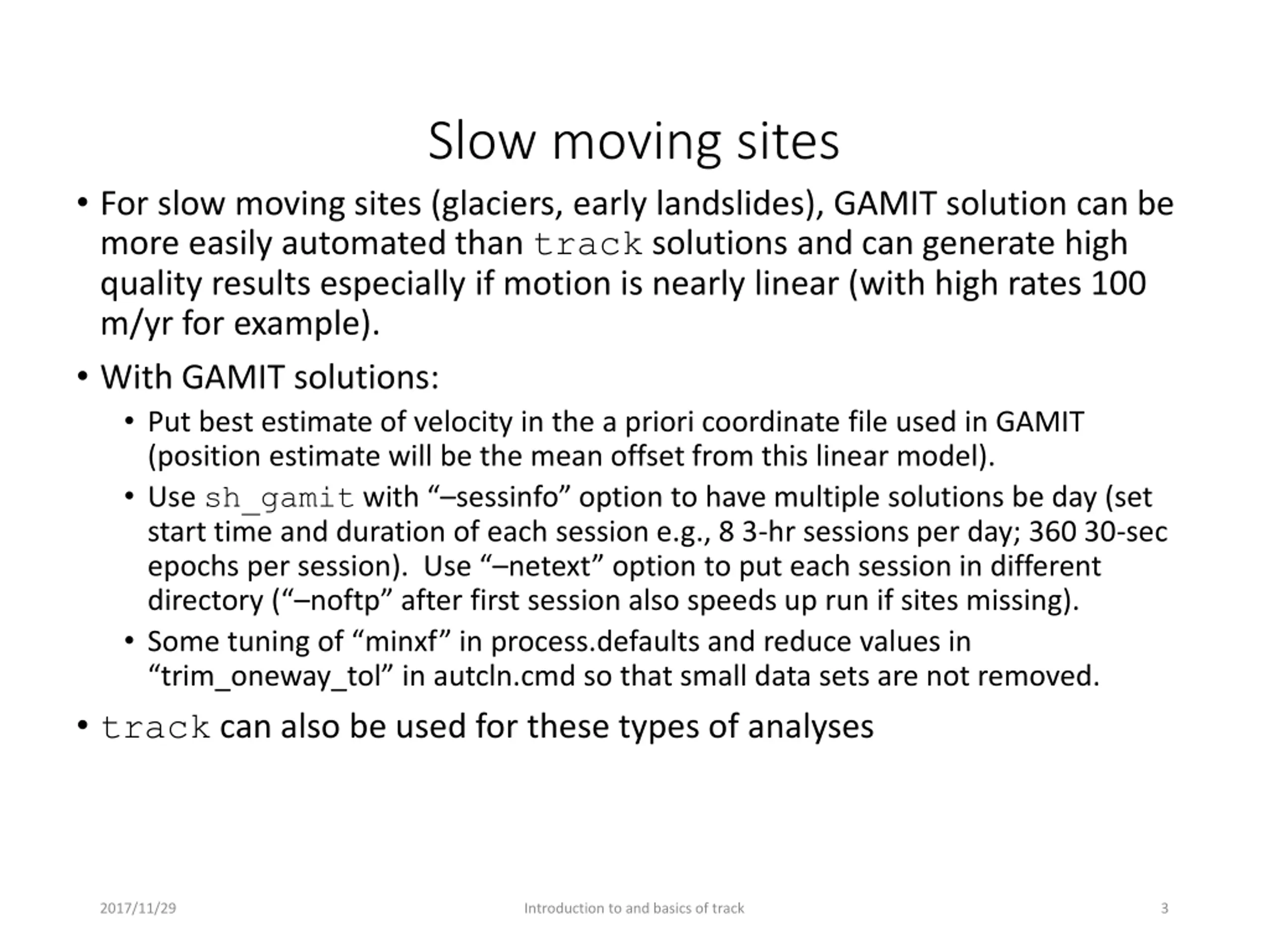 Slow moving sites For slow moving sites (glaciers, early landslides), GAMIT solution can be more easily automated than track solutions and can generate high quality results especially if motion is nearly linear (with high rates 100 m/yr for example). With GAMIT solutions: Put best estimate of velocity in the a priori coordinate file used in GAMIT (position estimate will be the mean offset from this linear model). Use sh_gamitwith sessinfo option to have multiple solutions be day (set start time and duration of each session e.g., 8 3-hr sessions per day; 360 30-sec epochs per session). Use netext option to put each session in different directory ( noftp after first session also speeds up run if sites missing). Some tuning of minxf in process.defaults and reduce values in trim_oneway_tol in autcln.cmd so that small data sets are not removed. track can also be used for these types of analyses 2017/11/29 Introduction to and basics of track 3