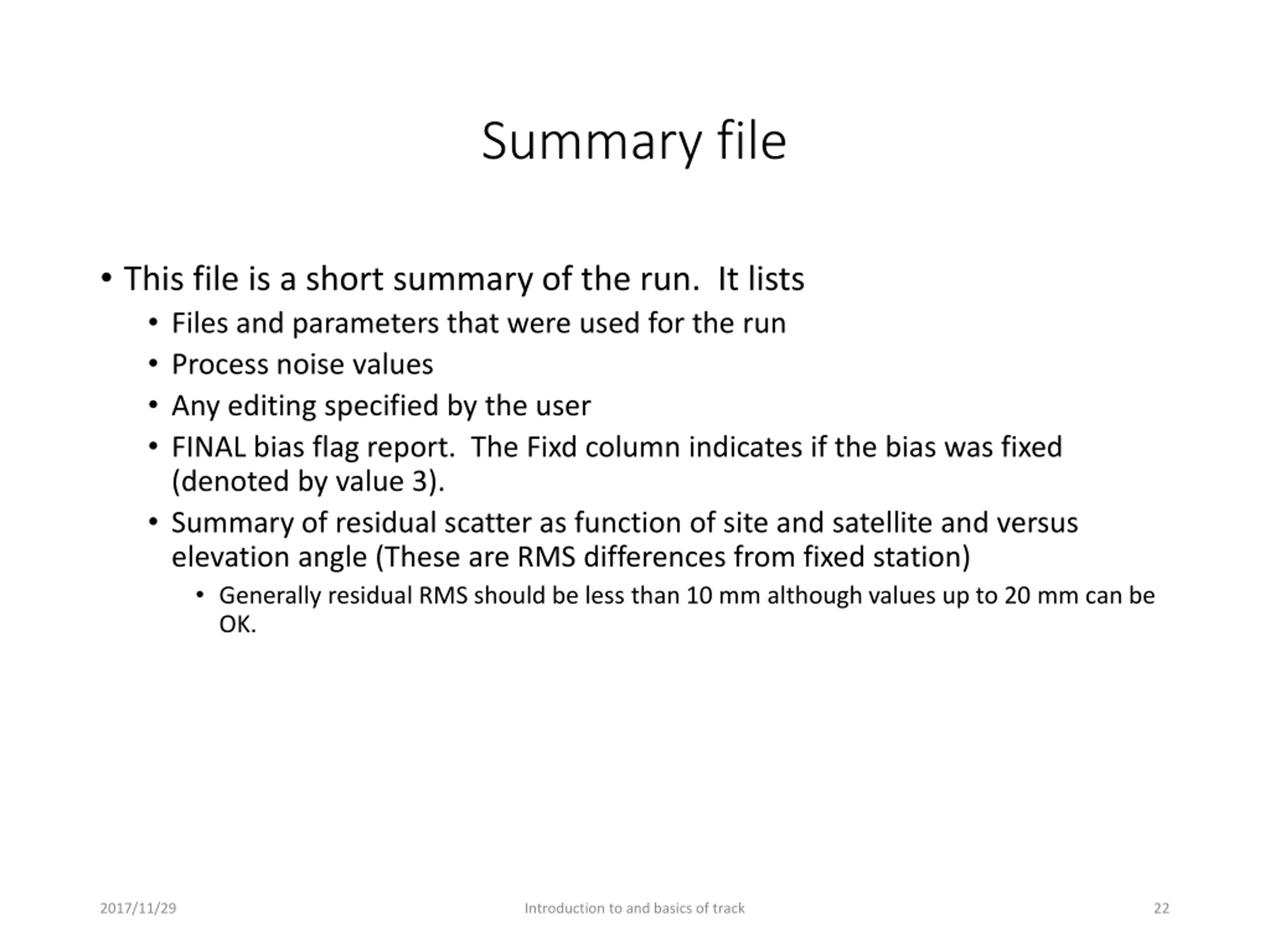 Summary file This file is a short summary of the run. It lists Files and parameters that were used for the run Process noise values Any editing specified by the user FINAL bias flag report. The Fixd column indicates if the bias was fixed (denoted by value 3). Summary of residual scatter as function of site and satellite and versus elevation angle (These are RMS differences from fixed station) Generally residual RMS should be less than 10 mm although values up to 20 mm can be OK. 2017/11/29 Introduction to and basics of track 22