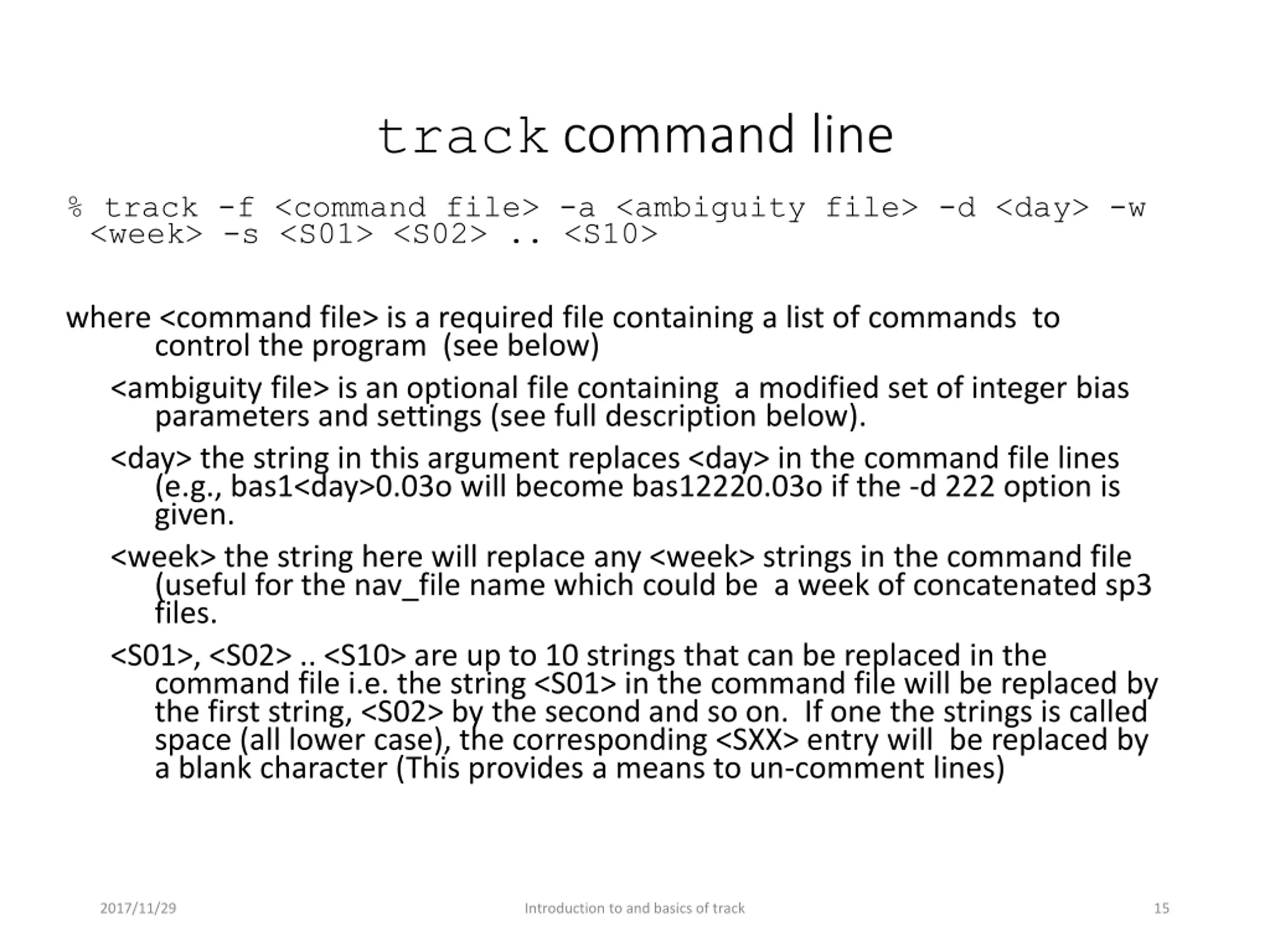 track command line % track -f <command file> -a <ambiguity file> -d <day> -w <week> -s <S01> <S02> .. <S10> where <command file> is a required file containing a list of commands to control the program (see below) <ambiguity file> is an optional file containing a modified set of integer bias parameters and settings (see full description below). <day> the string in this argument replaces <day> in the command file lines (e.g., bas1<day>0.03o will become bas12220.03o if the -d 222 option is given. <week> the string here will replace any <week> strings in the command file (useful for the nav_file name which could be a week of concatenated sp3 files. <S01>, <S02> .. <S10> are up to 10 strings that can be replaced in the command file i.e. the string <S01> in the command file will be replaced by the first string, <S02> by the second and so on. If one the strings is called space (all lower case), the corresponding <SXX> entry will be replaced by a blank character (This provides a means to un-comment lines) 2017/11/29 Introduction to and basics of track 15
