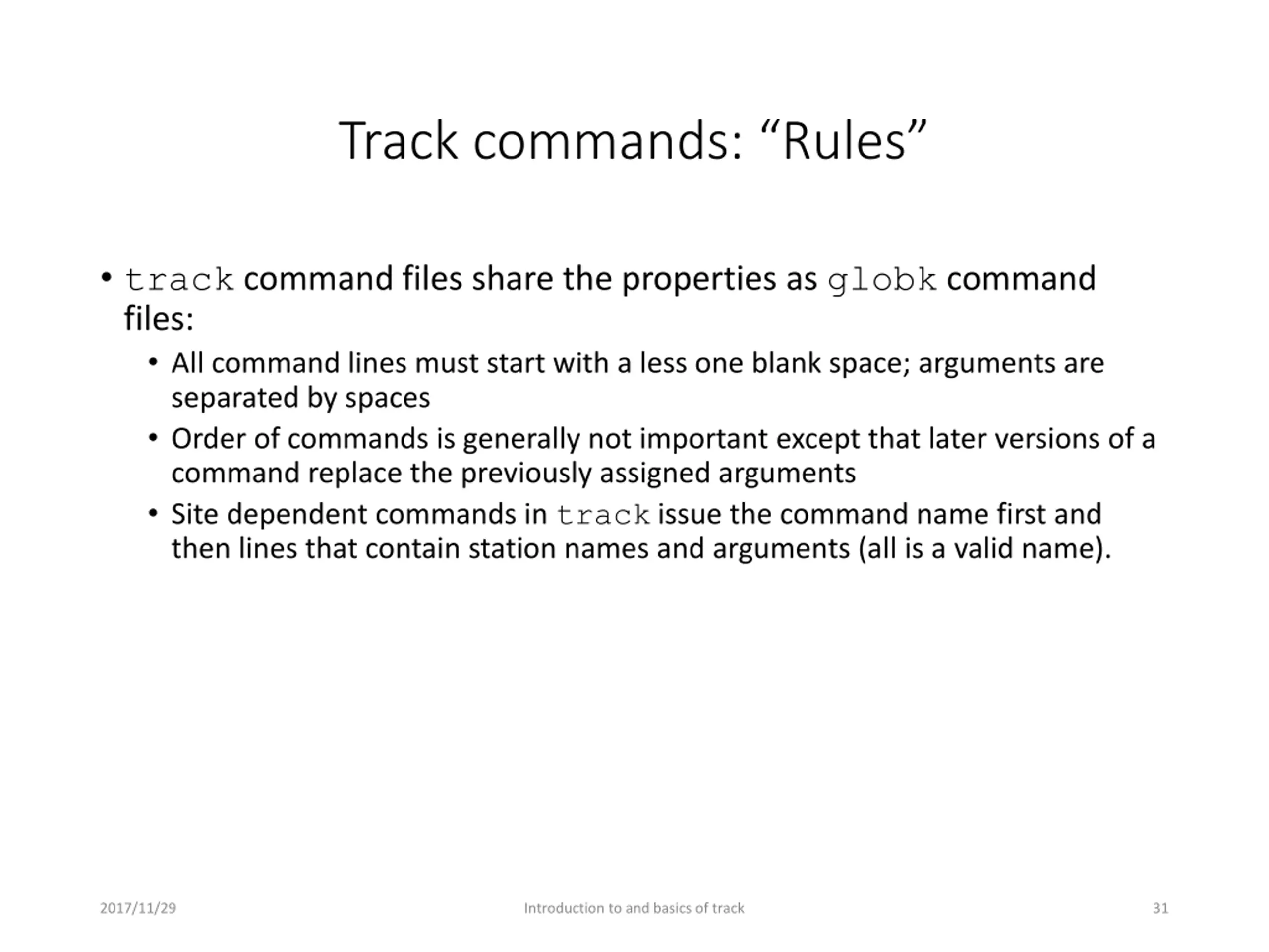 Track commands: Rules track command files share the properties as globk command files: All command lines must start with a less one blank space; arguments are separated by spaces Order of commands is generally not important except that later versions of a command replace the previously assigned arguments Site dependent commands in track issue the command name first and then lines that contain station names and arguments (all is a valid name). 2017/11/29 Introduction to and basics of track 31
