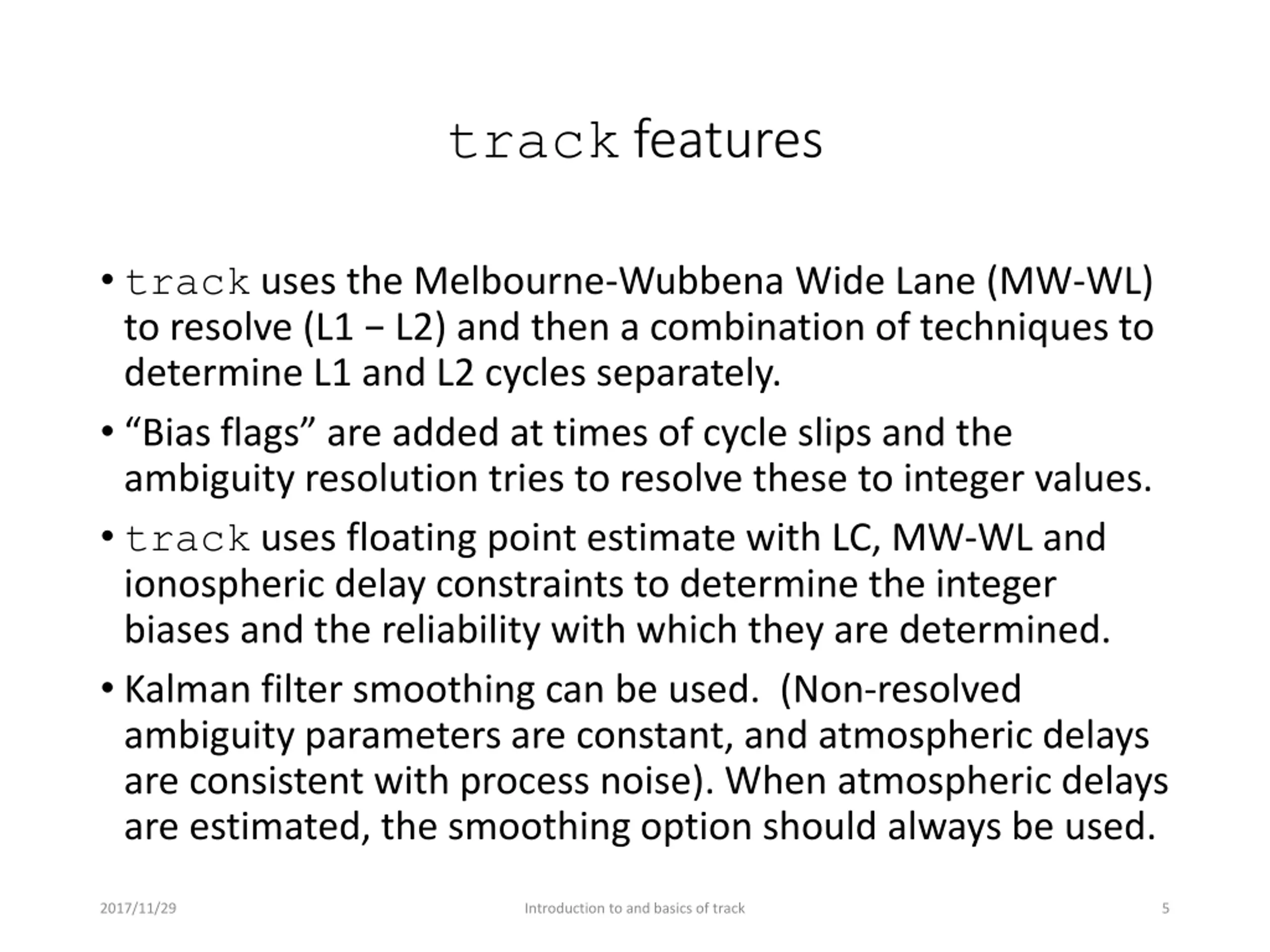 track features track uses the Melbourne-Wubbena Wide Lane (MW-WL) to resolve (L1 L2) and then a combination of techniques to determine L1 and L2 cycles separately. Bias flags are added at times of cycle slips and the ambiguity resolution tries to resolve these to integer values. track uses floating point estimate with LC, MW-WL and ionospheric delay constraints to determine the integer biases and the reliability with which they are determined. Kalman filter smoothing can be used. (Non-resolved ambiguity parameters are constant, and atmospheric delays are consistent with process noise). When atmospheric delays are estimated, the smoothing option should always be used. 2017/11/29 Introduction to and basics of track 5
