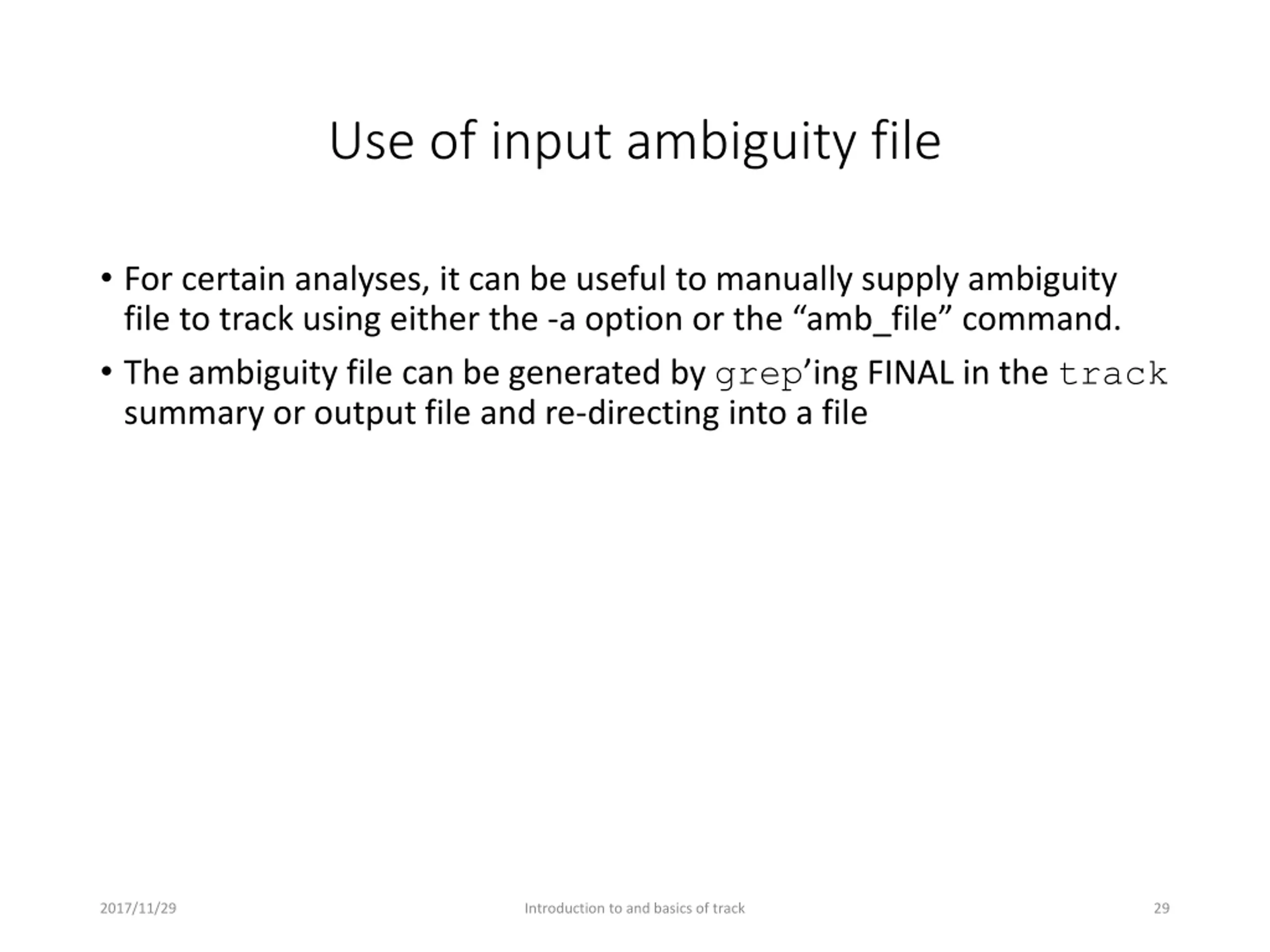 Use of input ambiguity file For certain analyses, it can be useful to manually supply ambiguity file to track using either the -a option or the amb_file command. The ambiguity file can be generated by grep ing FINAL in the track summary or output file and re-directing into a file 2017/11/29 Introduction to and basics of track 29