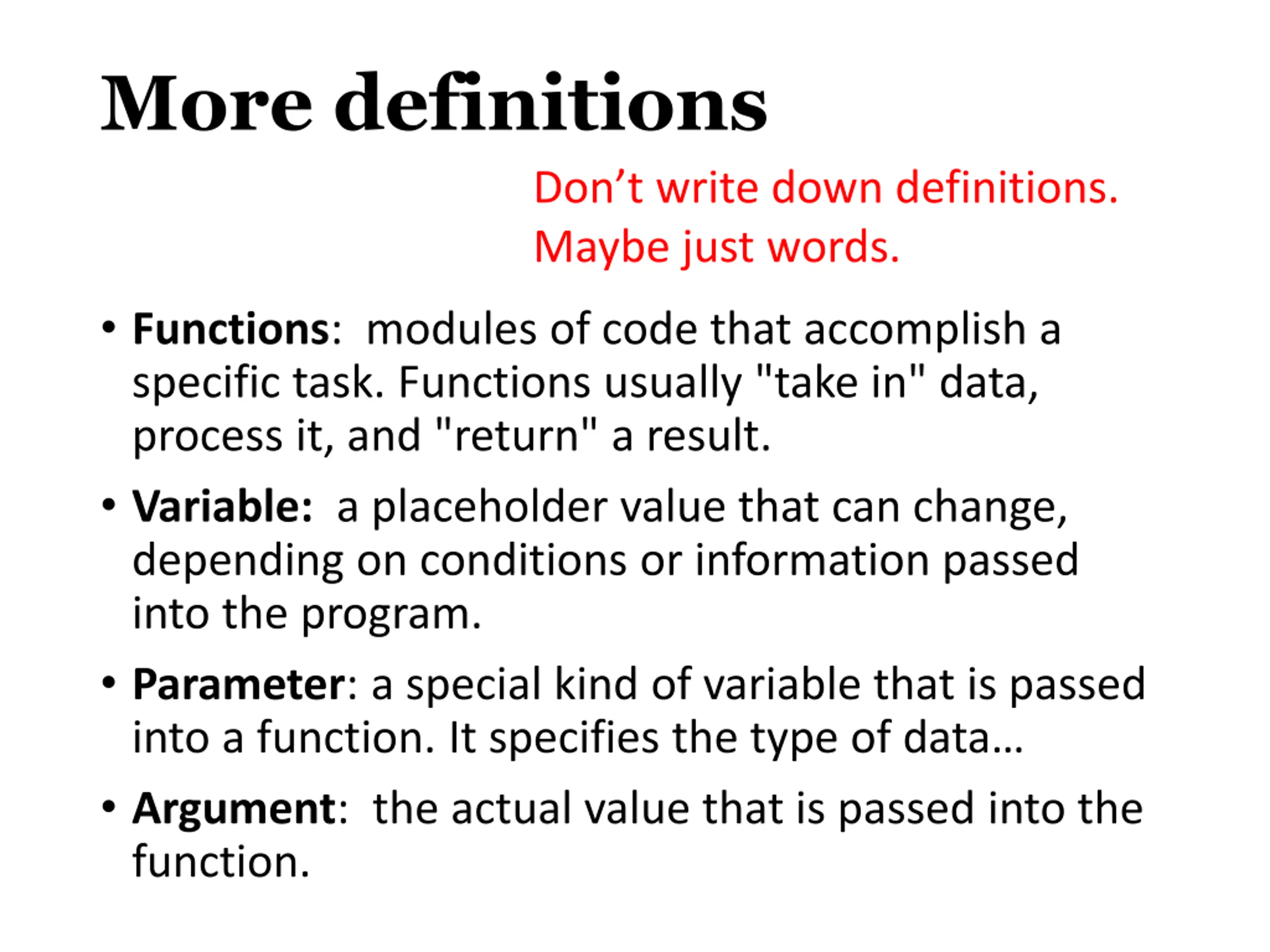 More definitions Don t write down definitions. Maybe just words. Functions: modules of code that accomplish a specific task. Functions usually "take in" data, process it, and "return" a result. Variable: a placeholder value that can change, depending on conditions or information passed into the program. Parameter: a special kind of variable that is passed into a function. It specifies the type of data Argument: the actual value that is passed into the function.