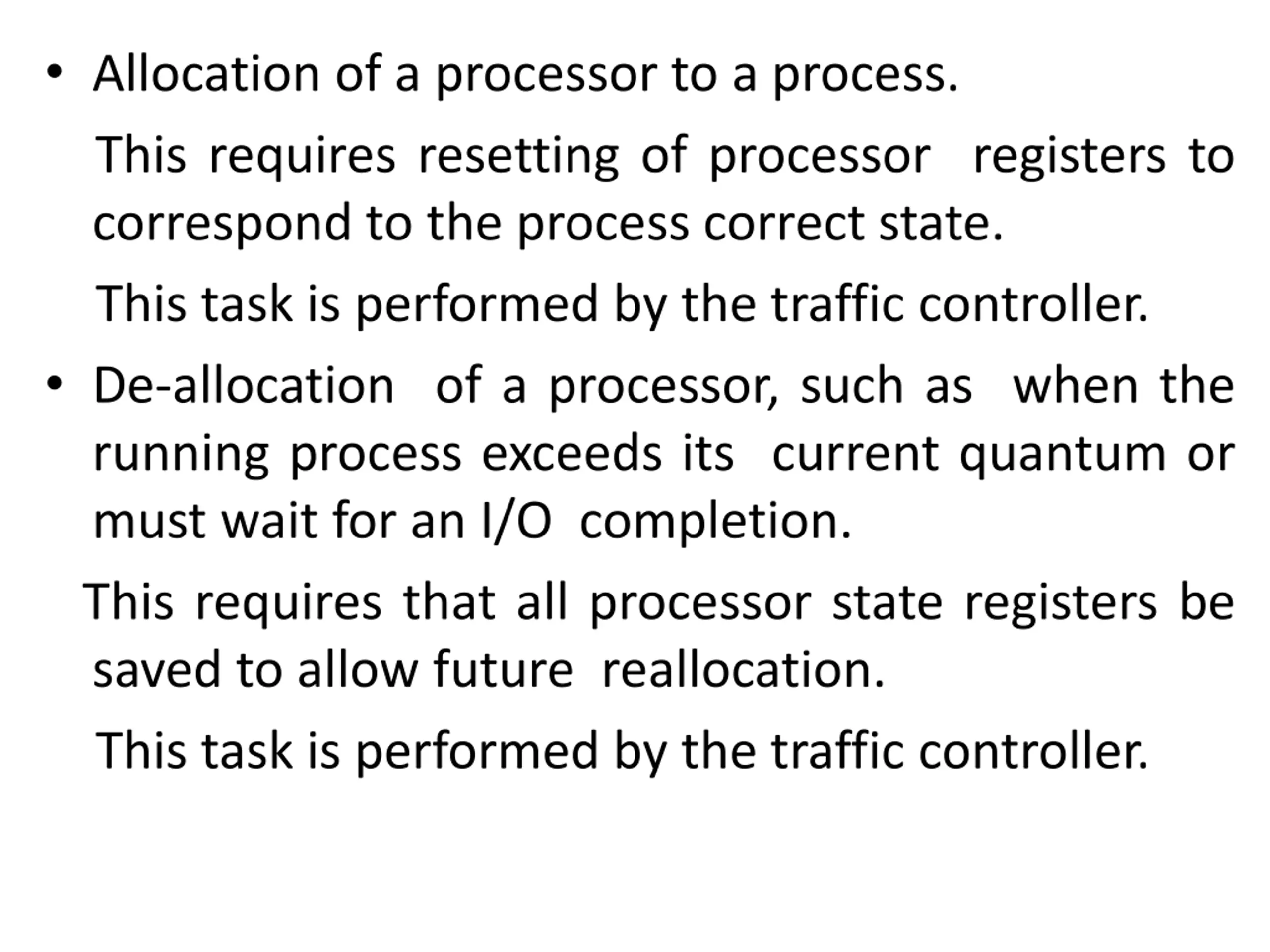 Allocation of a processor to a process. This requires resetting of processor registers to correspond to the process correct state. This task is performed by the traffic controller. De-allocation of a processor, such as when the running process exceeds its current quantum or must wait for an I/O completion. This requires that all processor state registers be saved to allow future reallocation. This task is performed by the traffic controller.