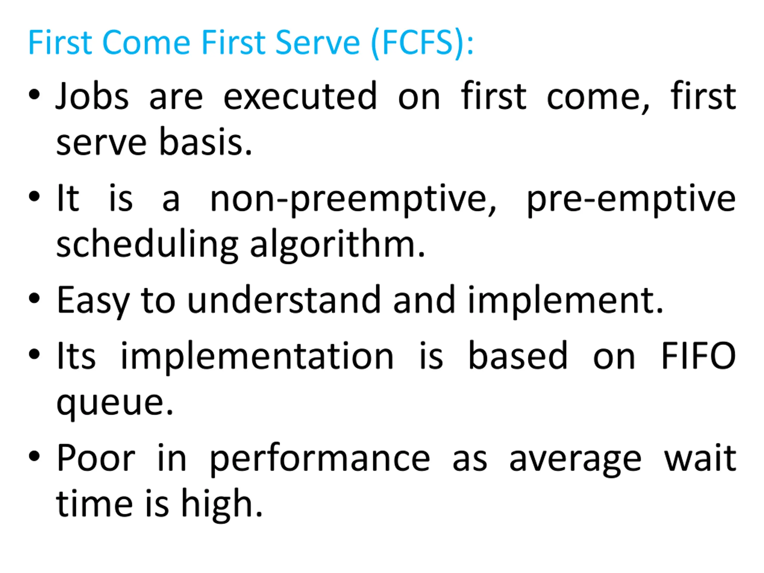 First Come First Serve (FCFS): Jobs are executed on first come, first serve basis. It is a non-preemptive, pre-emptive scheduling algorithm. Easy to understand and implement. Its implementation is based on FIFO queue. Poor in performance as average wait time is high.