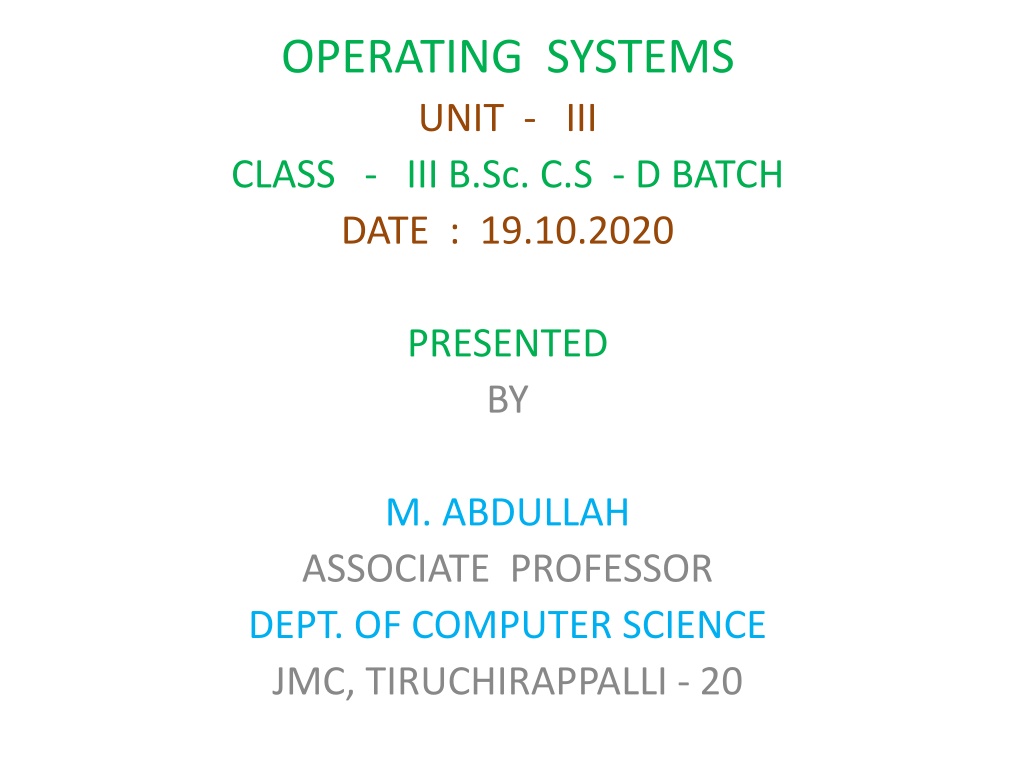 OPERATING SYSTEMS UNIT - III CLASS - III B.Sc. C.S - D BATCH DATE : 19.10.2020 PRESENTED BY M. ABDULLAH ASSOCIATE PROFESSOR DEPT. OF COMPUTER SCIENCE JMC, TIRUCHIRAPPALLI - 20