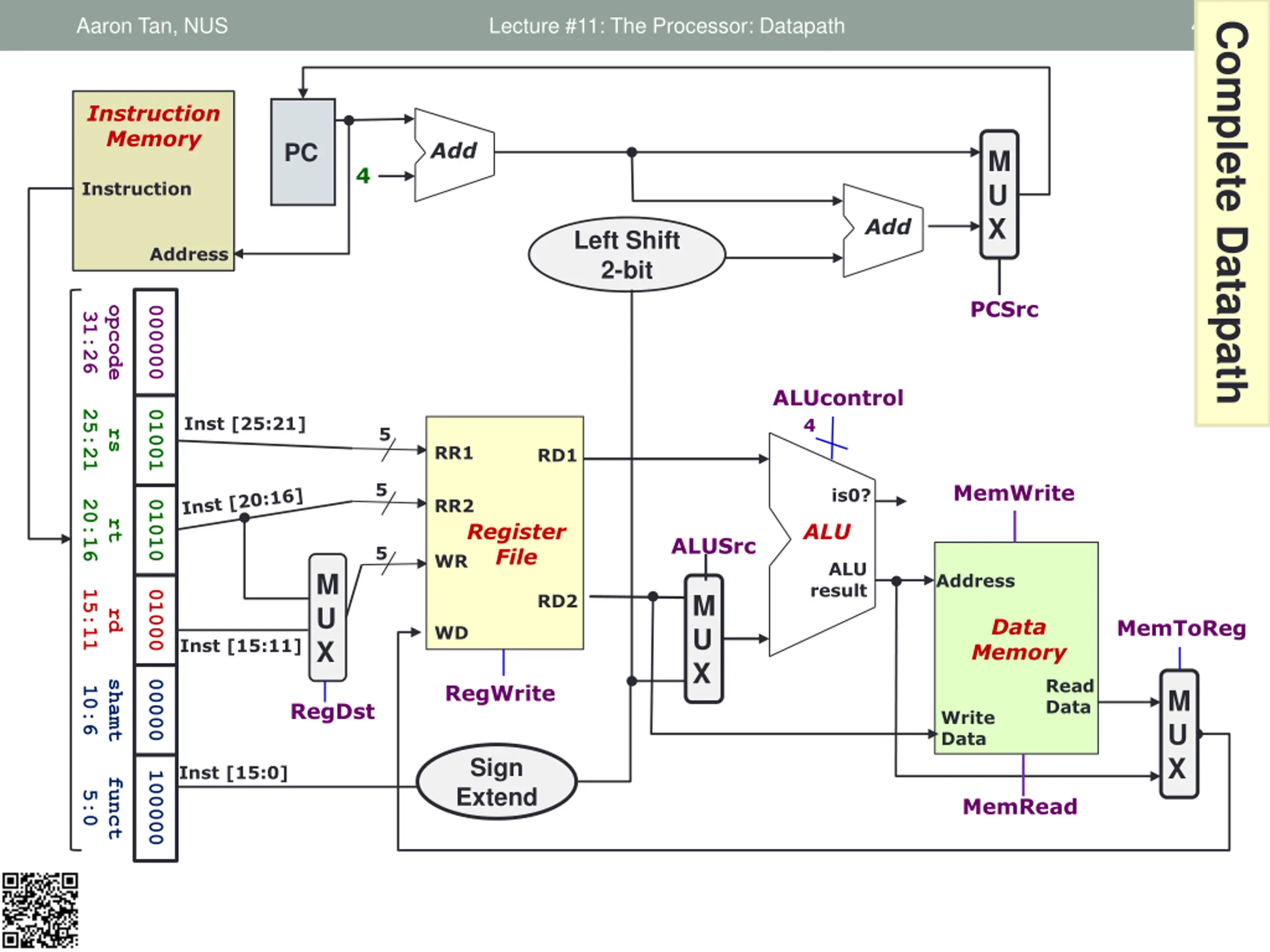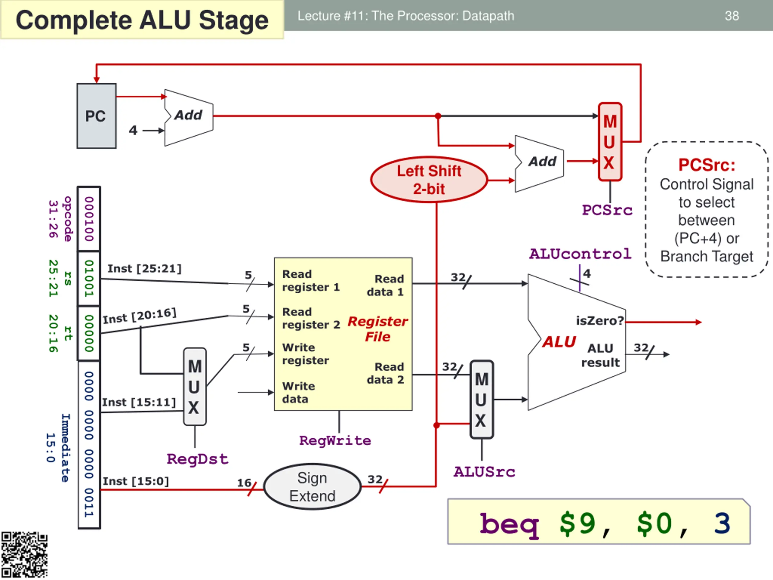 Aaron Tan, NUS Complete ALU Stage Lecture #11: The Processor: Datapath 38 Add PC M U X 4 Add PCSrc: Control Signal to select between (PC+4) or Branch Target Left Shift 2-bit opcode 000100 31:26 PCSrc ALUcontrol 25:21 01001 Inst [25:21] 4 Read register 1 5 32 rs Read data 1 5 Read register 2 Register File isZero? 20:16 00000 rt ALU 5 Write register ALU result 32 M U X 32 Read data 2 M U X 0000 0000 0000 0011 Write data Inst [15:11] Immediate 15:0 RegWrite RegDst ALUSrc Sign Extend 32 Inst [15:0] 16 beq $9, $0, 3