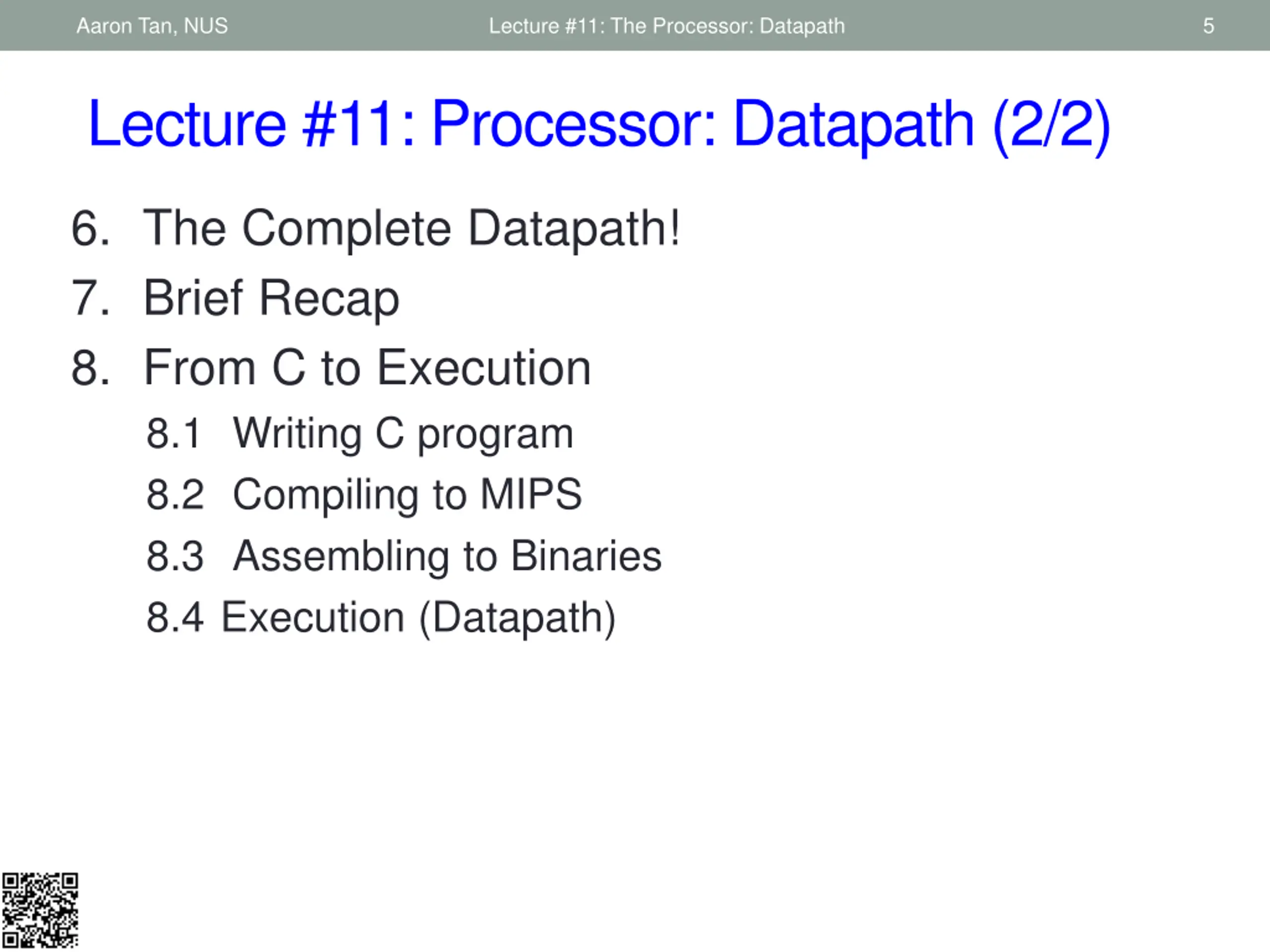 Aaron Tan, NUS Lecture #11: The Processor: Datapath 5 Lecture #11: Processor: Datapath (2/2) 6. The Complete Datapath! 7. Brief Recap 8. From C to Execution 8.1 Writing C program 8.2 Compiling to MIPS 8.3 Assembling to Binaries 8.4 Execution (Datapath)